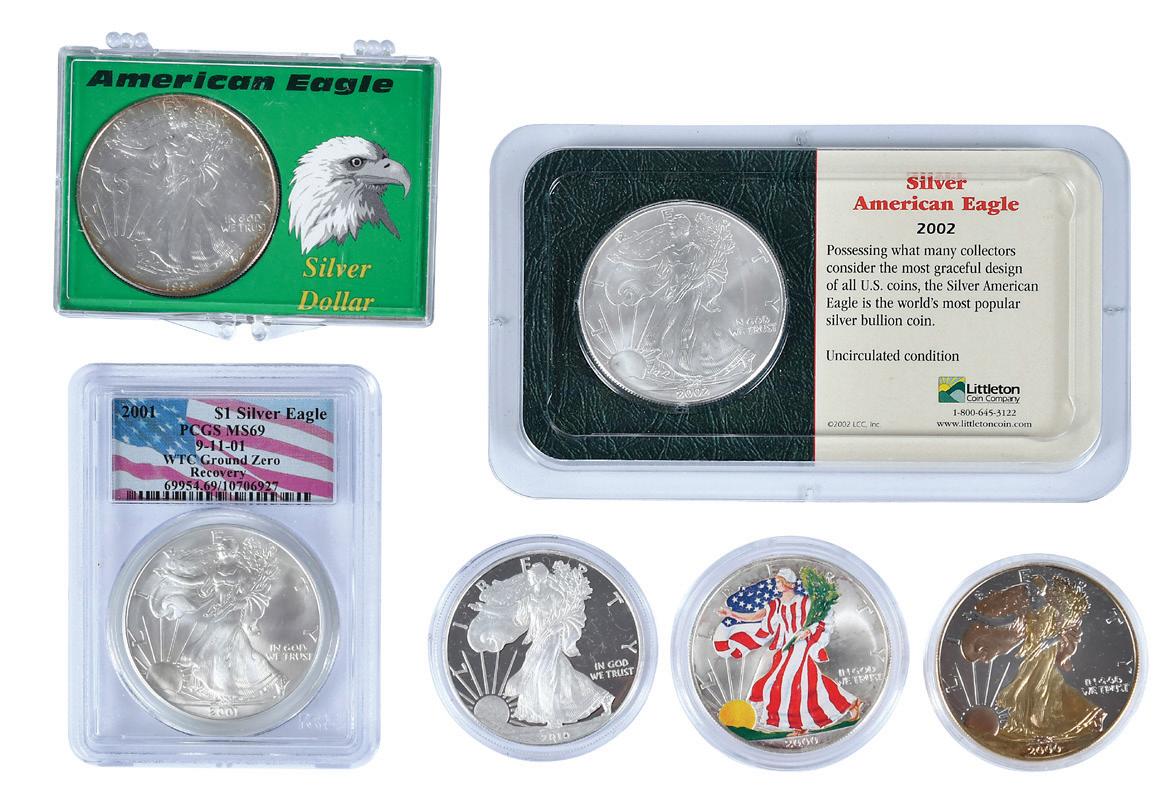 nice range of dates; ten are colorized; ten in Littleton blister packs; ten in APMEX baggies; ten in individual Littleton baggies; two from WTC Ground Zero recovery, one of those PCGS graded; 100 loose/raw Silver Eagles, many are BU, other loose coins with some evidence of handling or toning