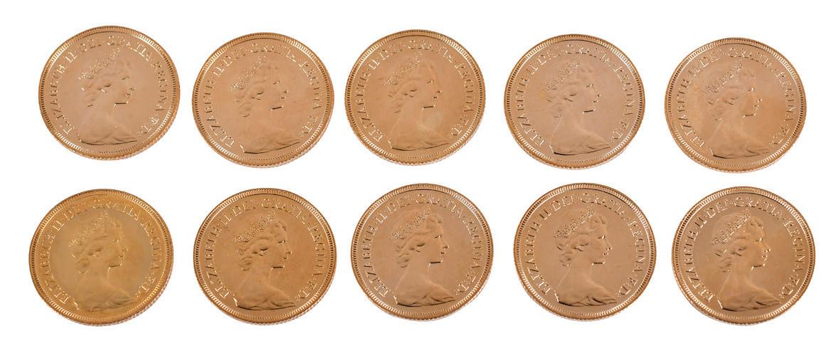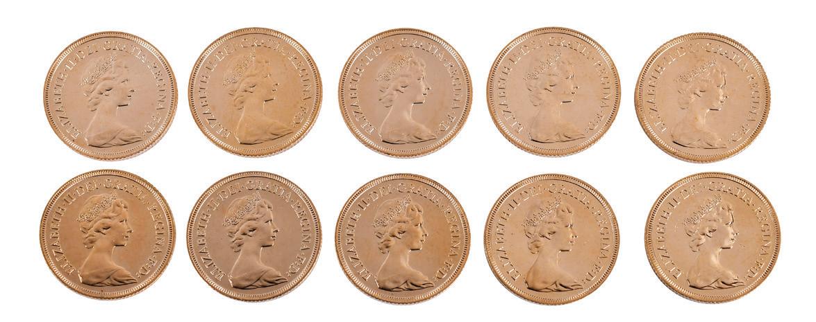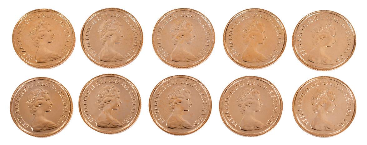 Ten 1981 British Gold Sovereign Coins each with an AGW (actual gold weight) of 0.2354 oz. T., UNC with brilliant luster