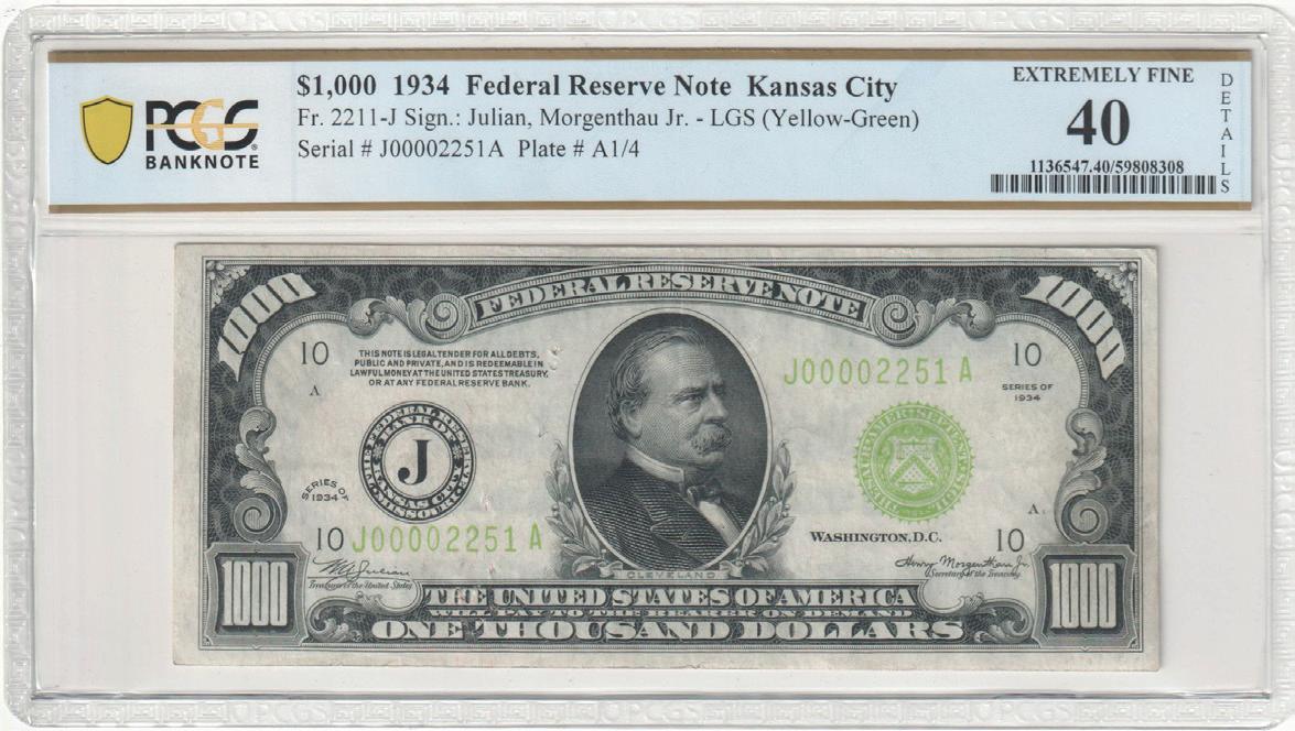 $1,000 Federal Reserve Note - Scarce Lime Green Seal Series of 1934, Fr. 2211-J, PCGS graded EF40 details, pinholes