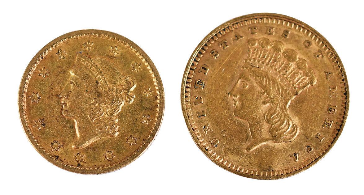 Type I and Type III gold dollars, each XF, slight bend to 1862