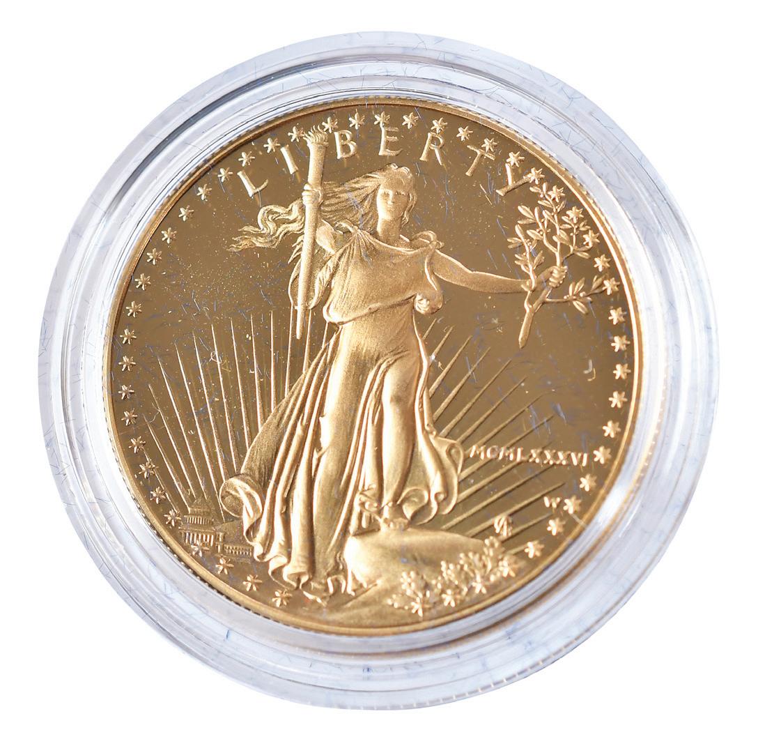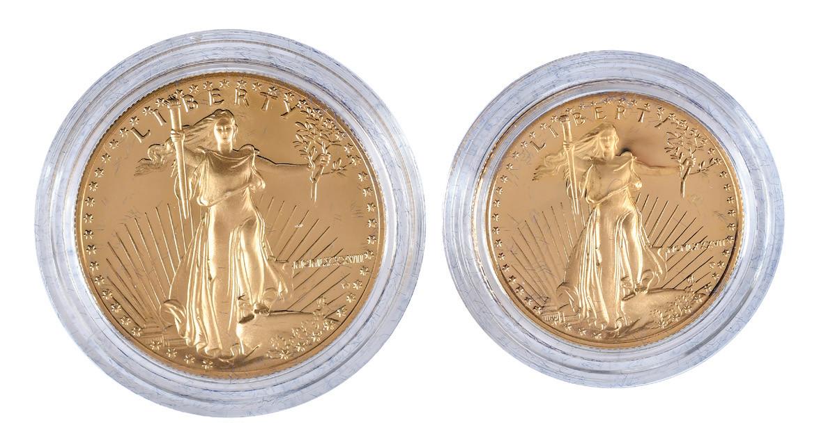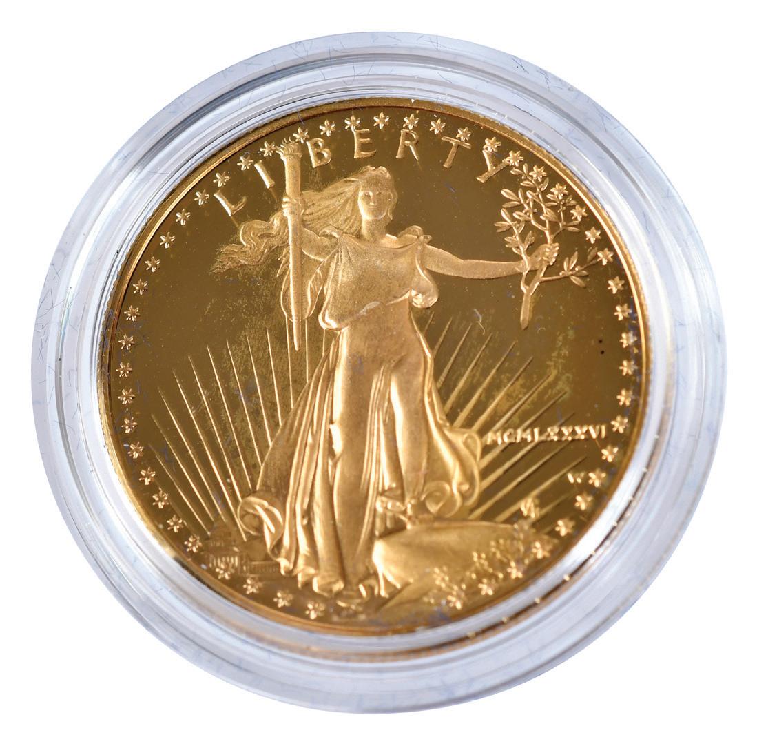 Three Gold American Arts Commemorative Medals, One-Ounce Each 1980 commemorative issue, Grant Wood, total AGW (actual gold weight) for this lot 3 oz. T., new, as issued
