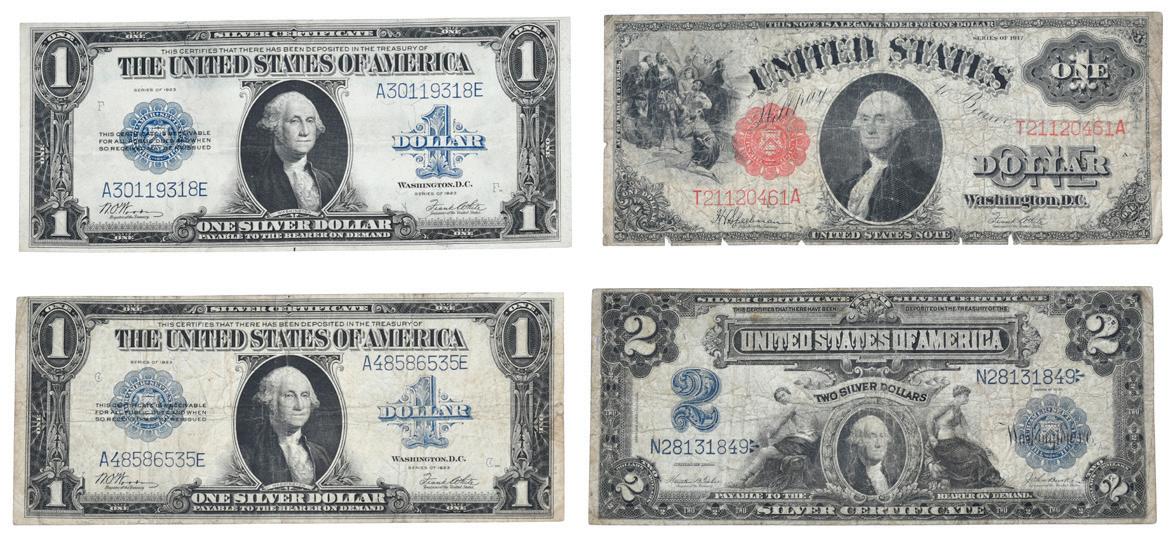 series of 1899 $2 silver certificate; series of 1917 $1 legal tender note; two series of 1923 $1 silver certificates, considerable wear from circulation
