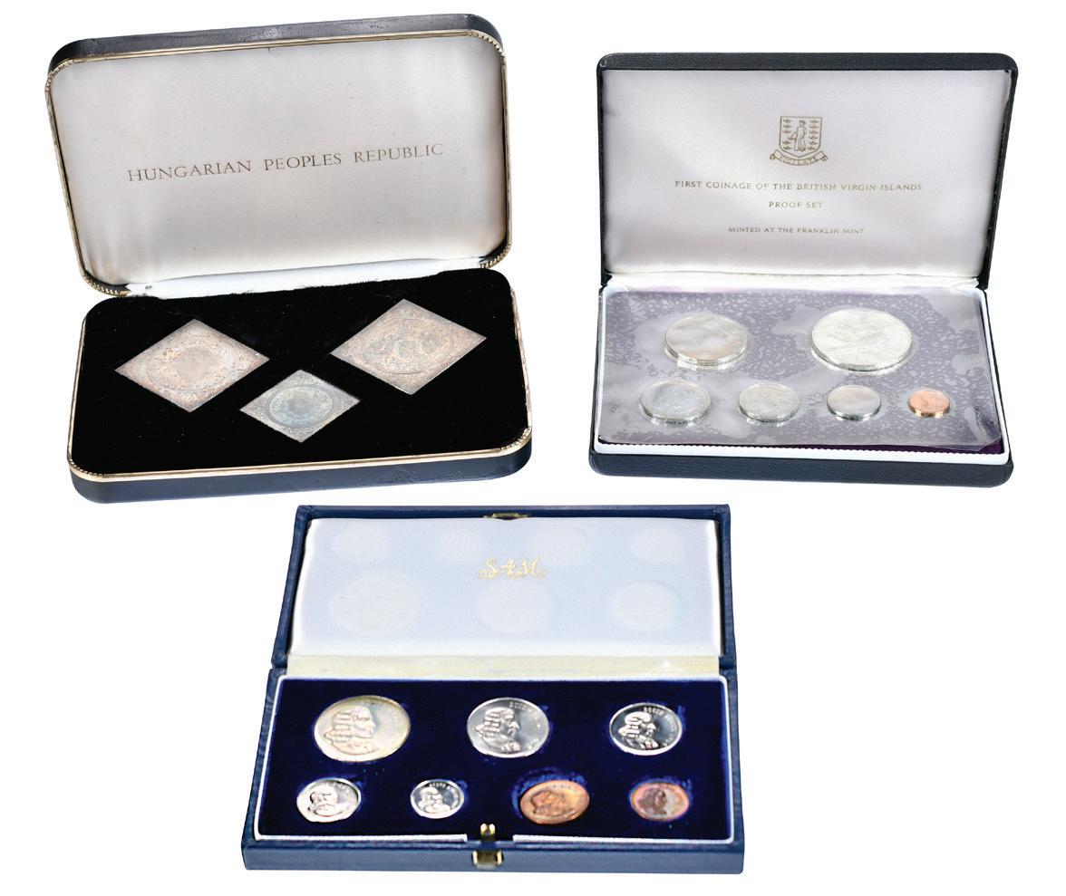 Five Assorted Foreign Coin Sets, South Africa, Hungary, British V. I. South Africa: 1965, 1966, and 1967 proof sets (1966 set missing the one cent coin); Hungary: gorgeous restrikes of two and five Pengo klippes, three coins total; British Virgin Islands: 1973 six coin set, first official coinage of the BVI, new, as issued with some toning