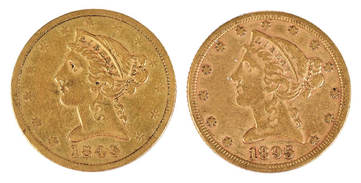$5 Half Eagle Gold Coins: 1843 and 1895 two Philadelphia Mint examples, each XF with minor marks