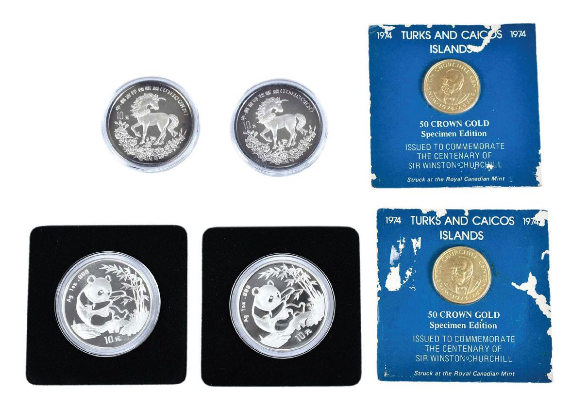 two 1974 Turks & Caicos Winston Churchill 50 Crown gold coins; two 1994 Chinese silver panda coins; two 1994 Chinese silver unicorn coins, new, as issued with some wear to outer packaging