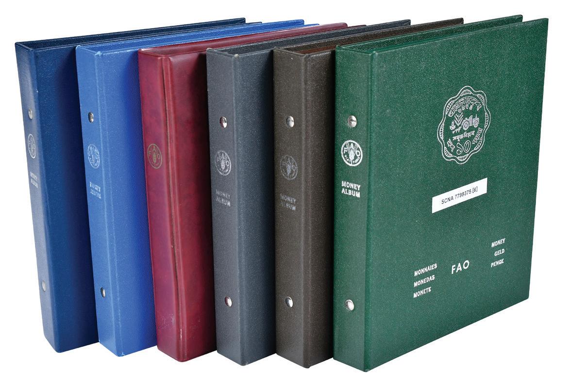 Six F.A.O. [Food & Agriculture] Coin Albums, World Coins over 200 coins from countries: Botswana, Bhutan, India, Mali, Sudan, Swaziland, San Marino, Jamaica, Syria, Nepal, Turkey, Iran, Liberia, Honduras, Vietnam, Saudi Arabia, Pakistan, Egypt, Bangladesh, Indonesia, Panama, Gambia, Morocco, Zambia, Tanzania, Singapore, Poland, Seychelles, West Africa, UAE, Rwanda, Uruguay, Algeria, Korea, Haiti, Thailand, Antigua, Dominica, Grenada, Anguilla, Montserrat, Saint Lucia, Saint Vincent, Iraq, Brazil, Yemen, Oman, Nicaragua, Tonga, Somalia, Isle of Man, Philippines, Fiji, Sao Tome & Principe, Sierra Leone, Burma, Maldives, Yugoslavia, Ethiopia, Solomon Islands, Tunisia, Comoros, Cape Verde, Guyana, Jordan, China, Trinidad & Tobago, Burundi, Lebanon, Uganda, Bolivia, Ceylon, Order of Malta, Vatican, Dominican Republic, new as issued, uncirculated