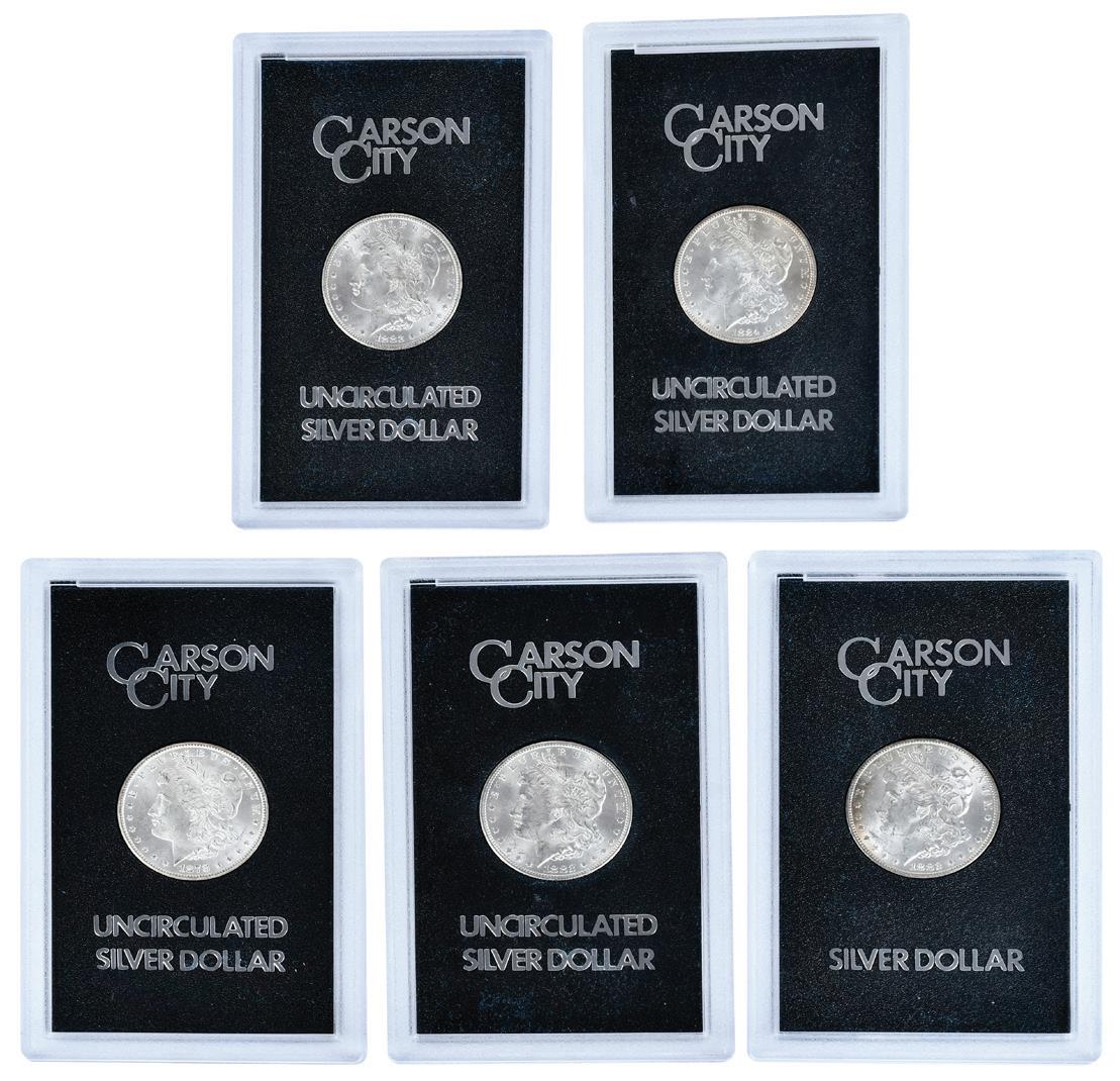 Five GSA Carson City Morgan Dollars 1878-CC, 1882-CC (x2), 1883-CC, and 1884-CC, coins UNC with light surface marks; some wear to packaging (spare 1882 with separated lid and missing COA)