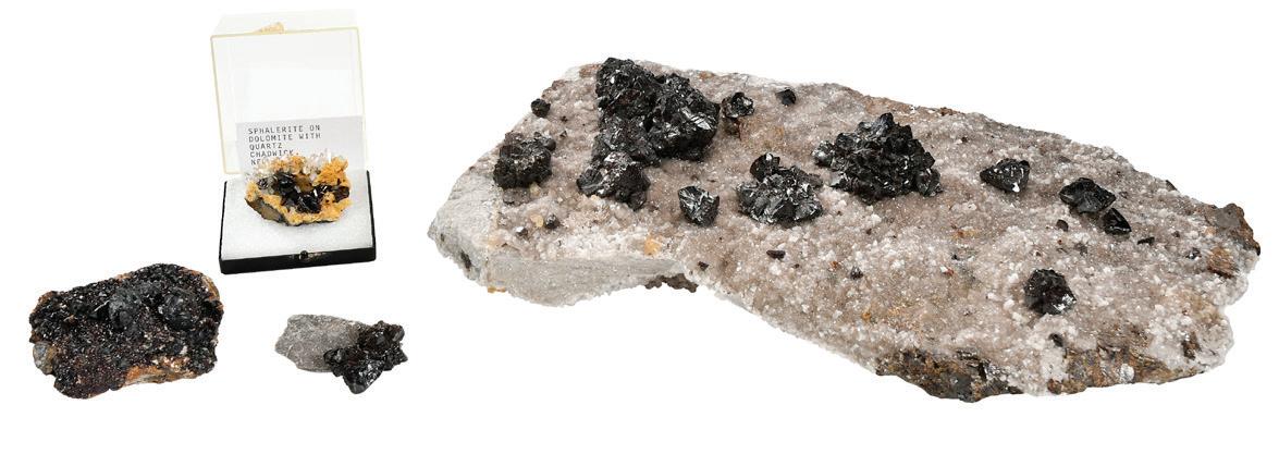 five specimens total, one with iron ore inclusion, some featuring other associated minerals such as galena and sphalerite, the largest specimen measures 3-3/4 x 7-1/2 x 4-1/2 in., and weighs 3.8 kg., abrasions, losses, residue, and fissures to specimens