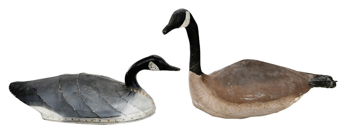 Two Canada Goose Decoys mid 20th century, comprising: Joe Hayman (Coinjock, North Carolina), canvasover-wire body, swimming form, laminate wooden head and neck, wooden bottom board with rigging loop, 9 x 26 x 9-1/4 in.; John Albert Lundgren (Kearney, Nebraska, patented 1941), wheat straw-stuffed, canvas-bodied field decoy, turned head, post receptacle at base, hanging loop at tail as made, 16 x 26 x 9 in., both with losses to paint, surface grime and handling wear commensurate with age and use, Hayman paint appears original with some crazing at breast, rust at tack heads, honest wear to canvas at frame joints, two small canvas punctures at left side, split at base of neck limited to one laminate section, Lundgren body likely repainted, heavy stitching at back, breast and tail may indicate burst seams, small canvas puncture at right side