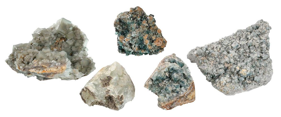 five specimens, one specimen originating from the Rogerly Mine in England, three specimens with well-formed frosted cubes, the largest 4 x 9 x 6-1/4 in. total weight 9.4 kg., losses, chips, and cracks with some residue on most specimens