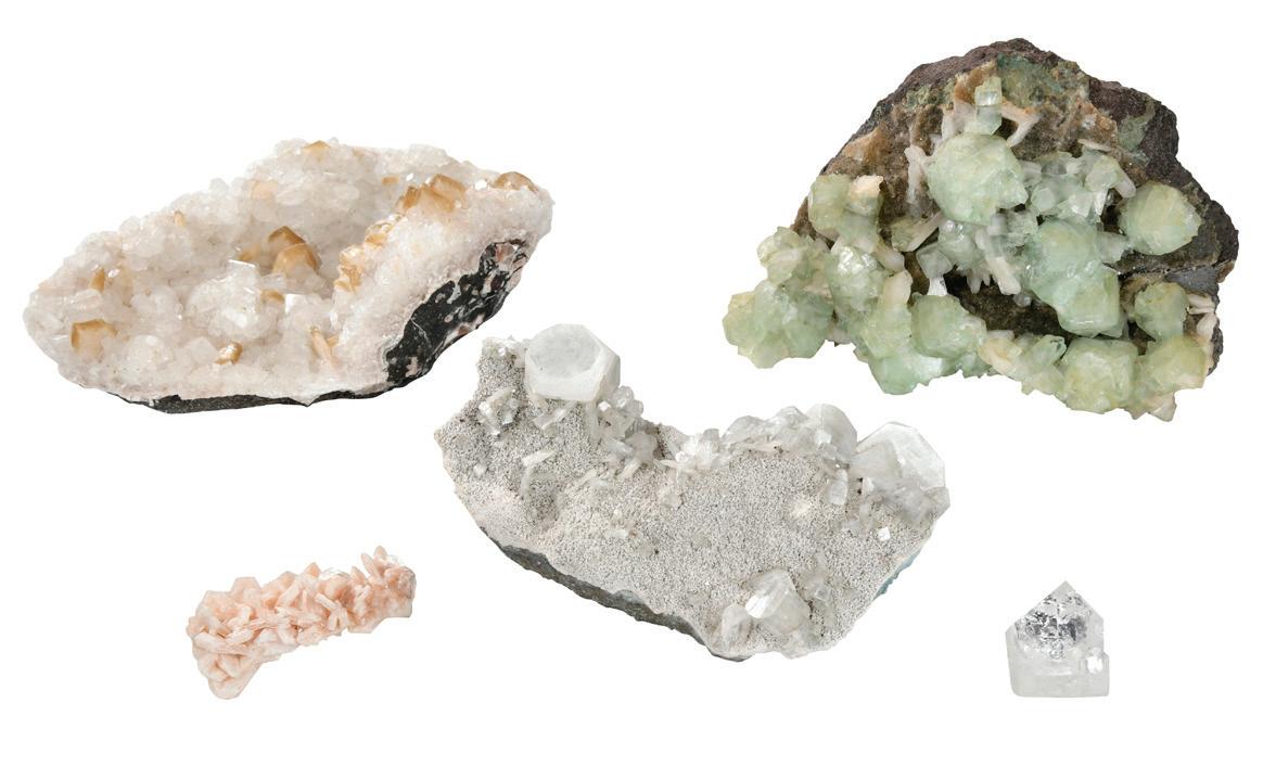 five pieces, one small apophyllite crystal termination tip, 1 x 7/8 in., one pink stilbite specimen from India, 7/8 x 2-1/4 in., one green apophyllite with stilbite specimen, 3 x 5-1/4 in., one apophyllite and stilbite specimen from Bombay, 2-1/2 x 6-1/4 in, and one with clear crystal apophyllite on associated mineral matrix, 2 x 5 in., losses, abrasions, residue, and chips to all specimens