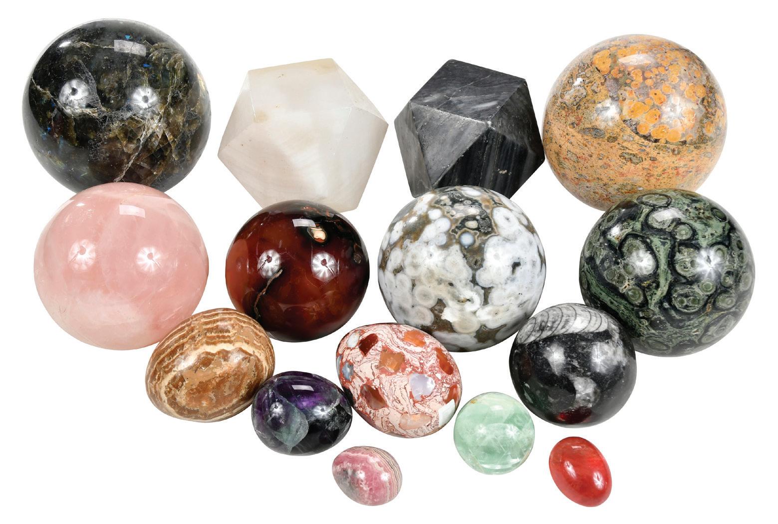 approximately 50 spheres, two 12-sided figures, the largest sphere weighing 1 kg. with a diameter of 9.2 cm, most spheres are in good condition, some with scrapes, losses, and residue