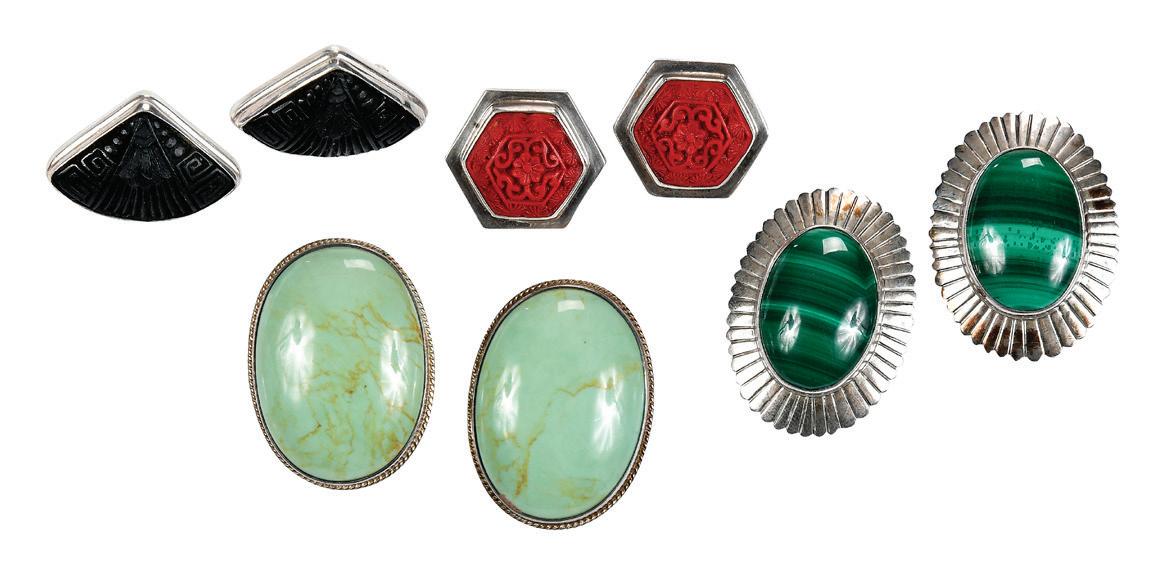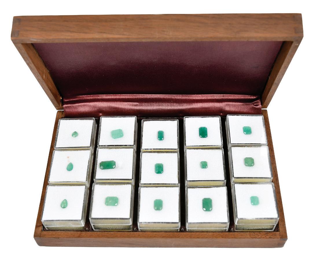 eight specimens total, two attached to one base, mostly green and blue specimens in a matrix, three specimens mined in Brazil, largest 4 x 10 x 5 in., losses, chips, fissures, and abrasions to specimens