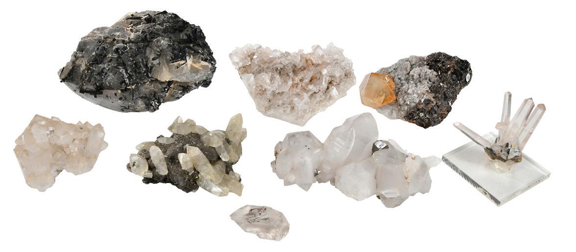 eight quartz specimens all with associated minerals including hematite, rutile, calcite, and sphalerite, some with mineral inclusions, the largest 2-3/4 x 5 in., most with losses and abrasions, some with residue