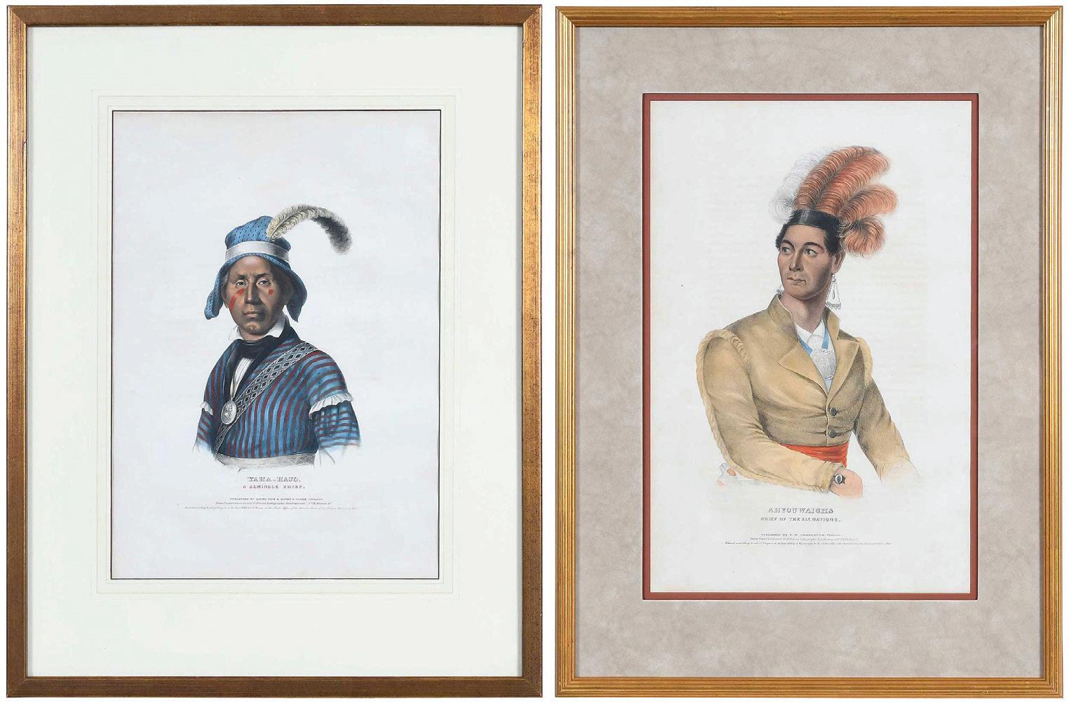 McKenney, Thomas L. (1785-1859) and James Hall (17931868): Yaha - Hajo, a Seminole Chief, sight 18-1/2 x 13 in.; Ahyouwaighs, Chief of the Six Nations, sight 19-1/4 x 12-1/2 in., both from the History of the Indian Tribes of North America, 1836-1843, D. Rice and J.G. Clark (1) and F.W. Grenough (1), Philadelphia, publishers, large folio, hand colored lithographs; gilt wood frames, largest 27-1/4 x 21-1/4 x 1-3/8 in., not examined out of frames, some light toning and text bleed, not apparently laid down; frames with abrasions