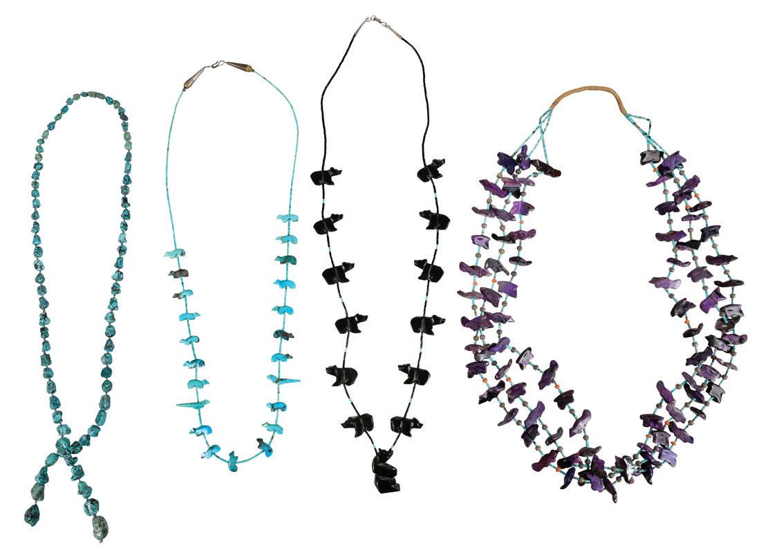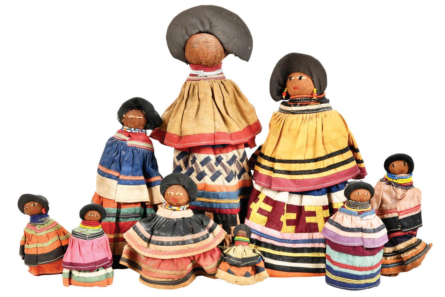 Nine Seminole Dolls all with fiber bodies, traditional patchwork cotton dress and all with beaded necklaces, the largest 11-1/2 in.; the smallest 2-1/4 in., all with grime commensurate with age, one with a loose bonnet, the smallest with one tear to dress