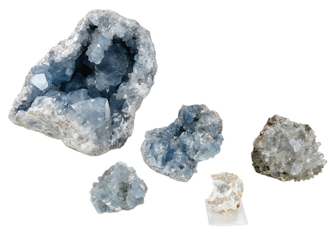 five specimens, all with nice light blue terminations, celestite is a primary source for strontium which lends the vibrant red color to fireworks, the largest 6-3/4 x 5 x 4-1/2 in. total weight 5.6 kg, losses, abrasions, chips, and cracks to specimens