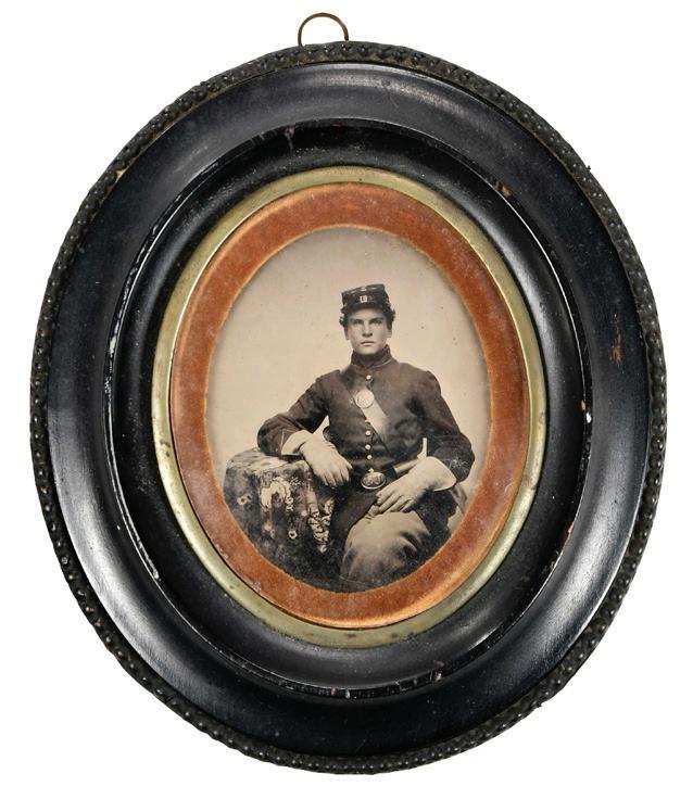 Framed Civil War Ambrotype, Union Soldier 19th century, retrograde image of a seated Union soldier in full uniform, oval wooden frame, overall 7 x 6-1/4 in., good overall, typical frame abrasions, slightly loose glass