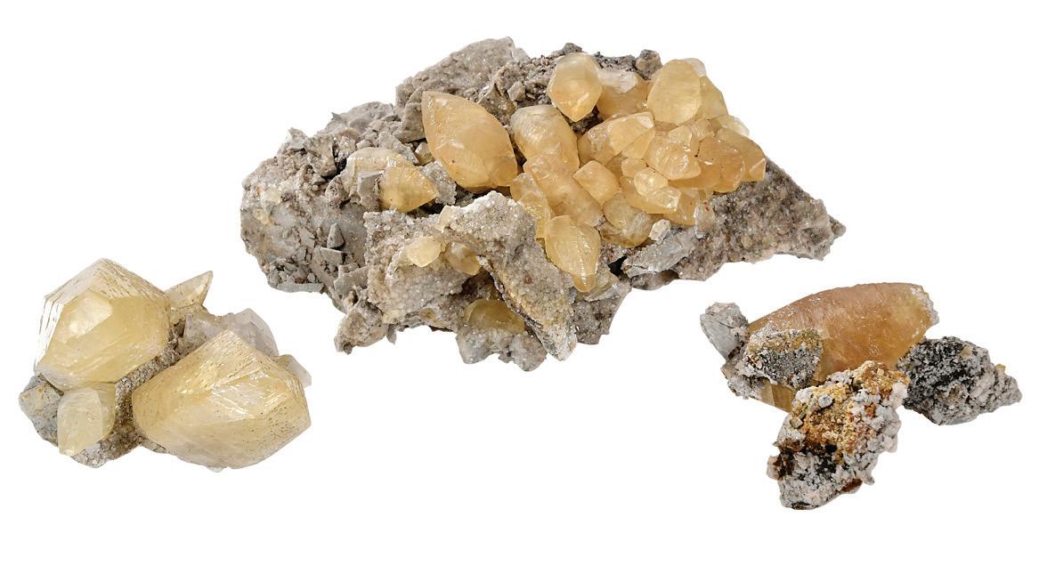 three honey calcite examples on matrix with associated minerals, largest 3-1/2 x 10-1/2 in., losses to minerals and matrices, abrasions, scratches, and residue