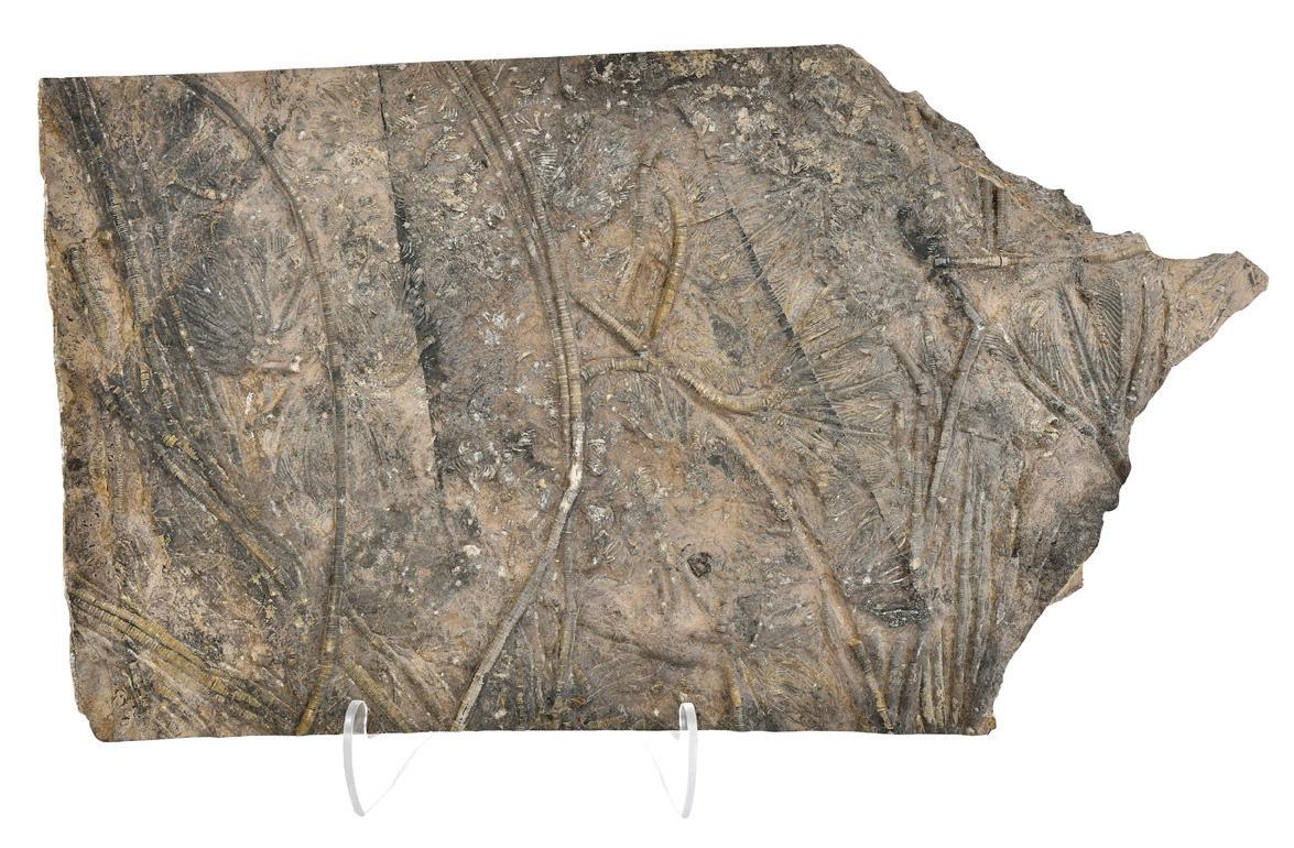 assortment of flora and maritime fossils, sixteen specimens total, largest 4-3/4 x 6-3/4 in., abrasions, losses, fissures, and residue to most specimens
