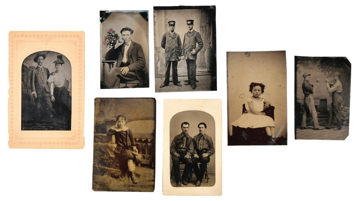 19th century, variety of subjects: uniformed workers, ladies, fancy attire, stoic posed images, Roma couple, bicycle, children, possibly one woman of color, two with larger matting surround, single framed example 6 x 4-1/2 in. overall, expected abrasions to surfaces, some clipped corners, crackle or deterioration