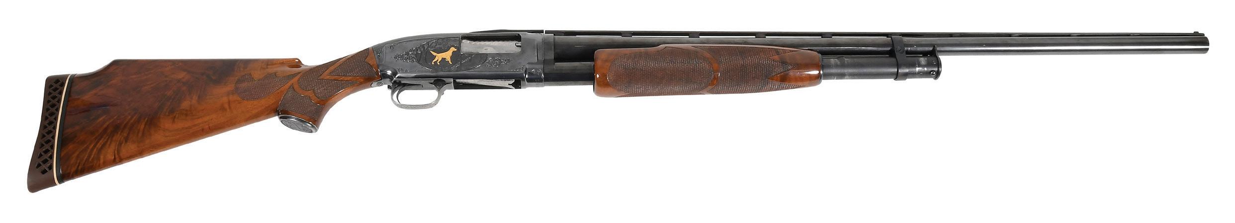 12 g., 30 in. S/N 1566585, full choke barrel, raised vented rib with duck bill receiver extension, double bead sights, engraving on receiver, two gold inlaid ducks to one side of receiver, gold inlaid hunting dog on opposing side, jeweled bolt and carrier, high gloss figured walnut forend with five point checkering at front and rounded oval two sided checkering at back, high gloss figured Monte Carlo pistol grip stock, “White Line” Pachmeyer butt pad, LOP 14-1/2 in. with extra release trigger assembly, two trigger shoes, hard fur lined case, scratches and wear to bluing on tube and barrel from pump action, shiny bore with frosting towards the end, wear to the tube, oxidation on barrel bands, exterior of barrel little evidence of use, receiver and wooden components with little evidence of use, likely aftermarket forend and stock, slide action and trigger appear to function