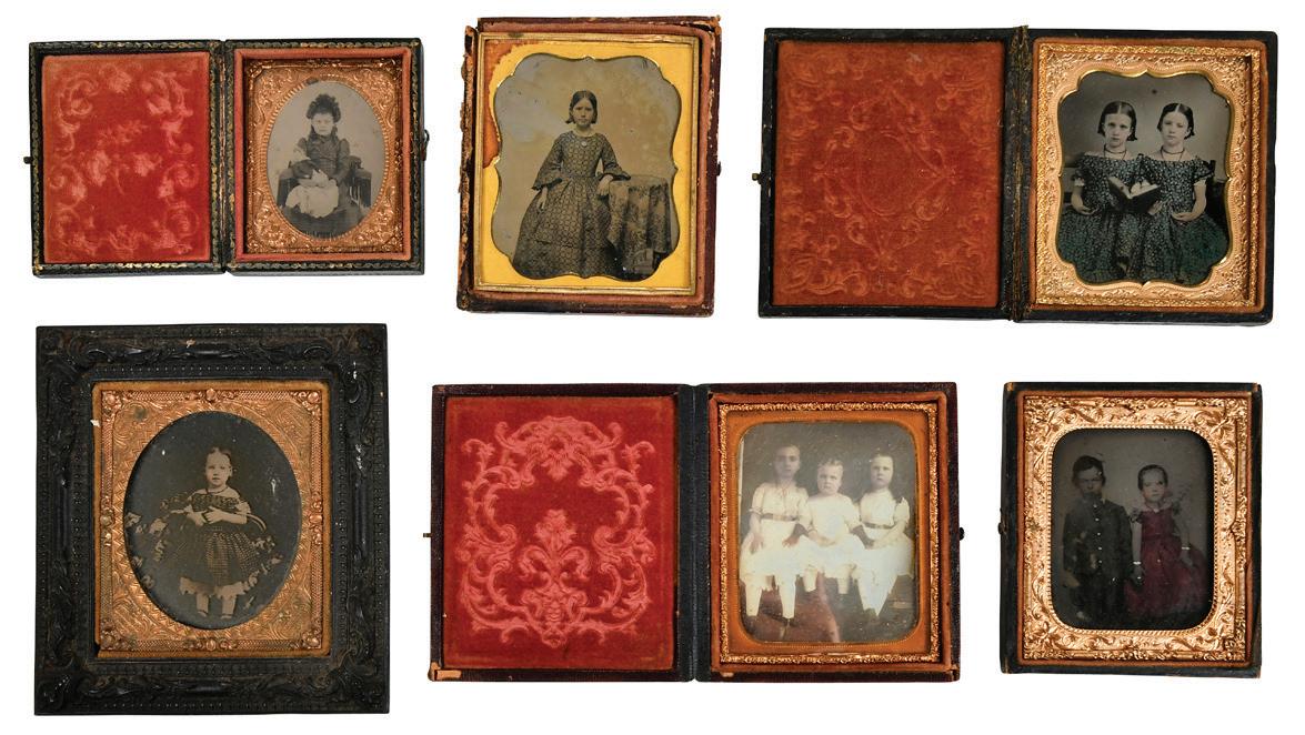19th century, six images of children in period attire, occasional color enhancement, each housed in frame with gilt accents, largest 5 x 4-1/2 in., typical condition overall, wear and abrasions to cases, some weak hinges or full separation