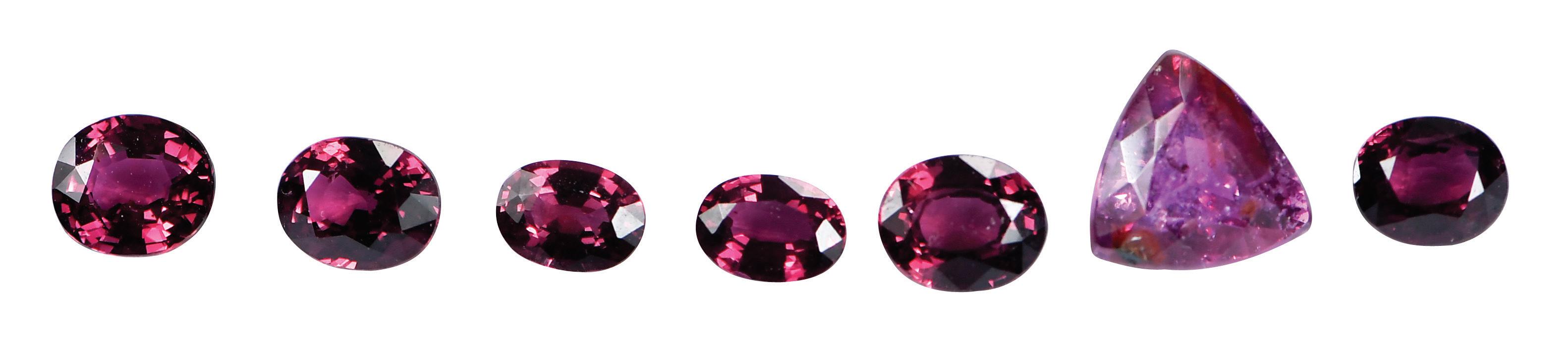 eight specimens including one large freeform watermelon tourmaline, one watermelon tourmaline slice, one magnetite octahedron in greenschist matrix from Diamantina mine, one Iron Rose, one reddish brown heulandite specimen, one spessartine, two tourmaline shards on stand, largest 1-3/4 x 2 in., residue on most, small fissures, abrasions, and losses to all specimens