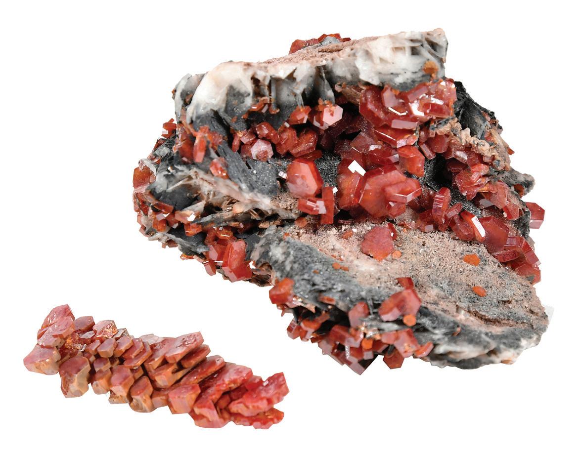 two specimens with nice hexagonal crimson crystals, the larger specimen on matrix with associated minerals, measures 1-3/4 x 3 in., losses, abrasions, cracks, and scrapes to both