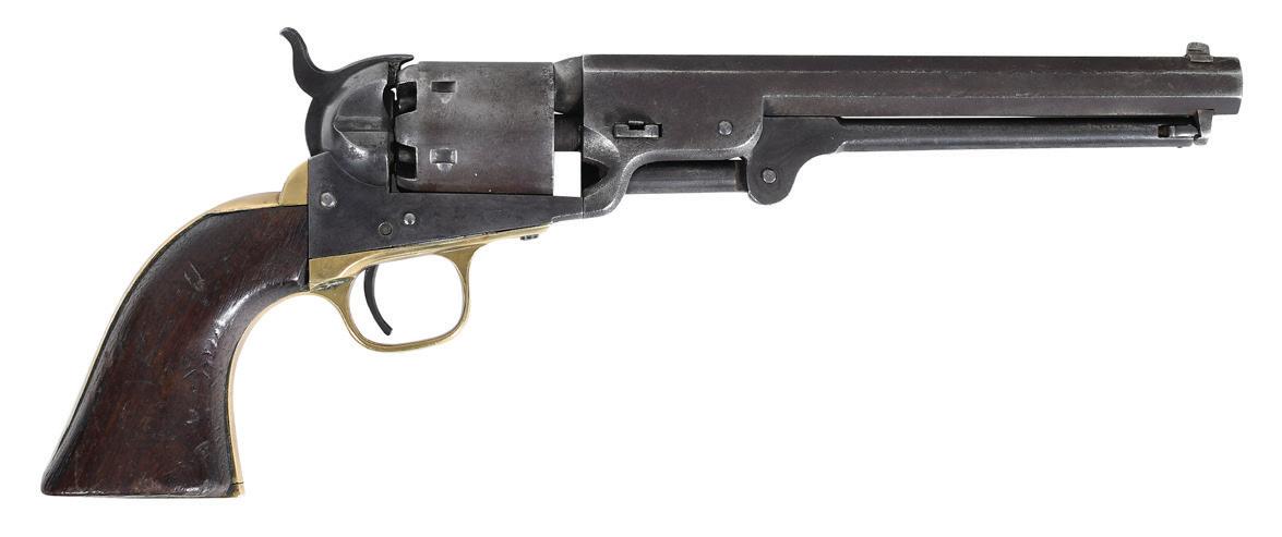 serial number 145655 stamped on four places under the frame, “IP” stamped under the serial number in three places, 45655 on cylinder, arbor and barrel wedge, 5655 on the loading lever, “ADDRESS COL. SAML COLT NEW-YORK U.S. AMERICA” stamp on top of 7-1/2 in. octagonal barrel with dovetail blade front sight, “COLT PATENT” on left side of frame, “36CAL” on side of brass near trigger guard, “2” stamped on left side of trigger guard, “8904?” in script inside the one piece walnut grip, “RKHW” cartouche to right side of walnut grip, likely “CGC” on left side of grips, brass backstrap, overall 13-1/4 in., handling wear and oxidation to metal components, some dings and abrasions, oxidation in cylinders, oxidation in barrels, cylinder does not rotate with the action, hammer will set and trigger will function, grips appear to be replaced and slightly undersized, wear, chips and abrasions to grips, abrasions to backstrap, wear and oxidation to engraved scene on cylinder, very faint remnants apparent