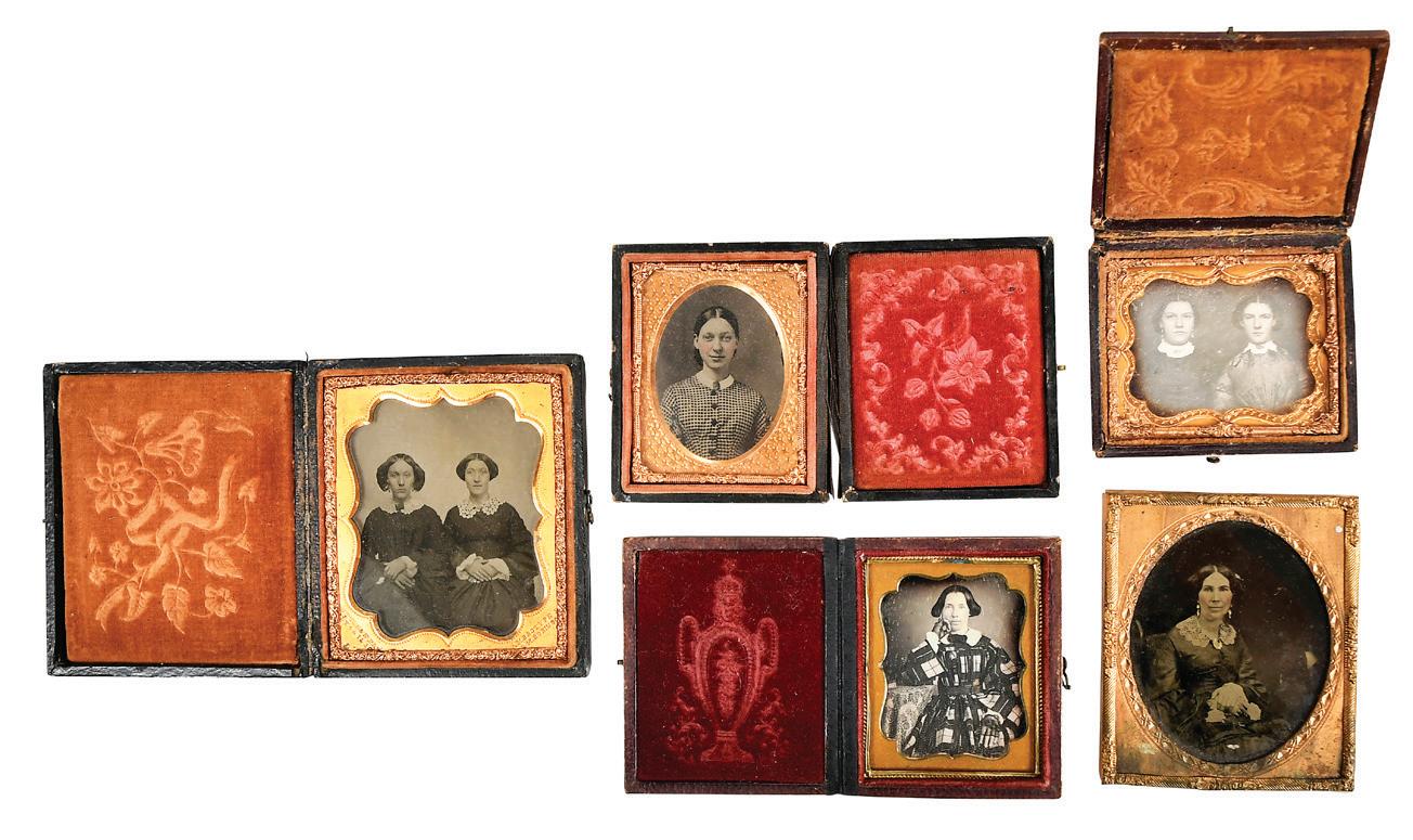 Group of Five Daguerreotypes of Ladies 19th century, five images of ladies in period dress, each housed in frame with gilt accents, largest 6-1/2 x 3-1/2 in. (opened), typical condition overall, wear and abrasions to cases, some weak hinges and full or partial separation