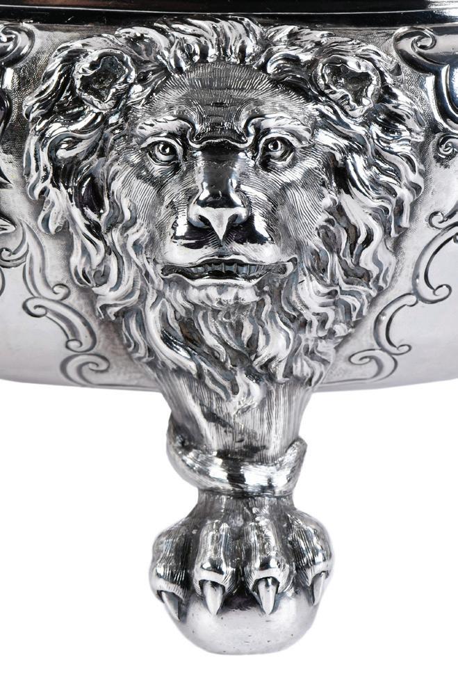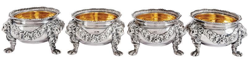 Set of Four George II English Silver Salts, Peter Archambo, London, 1740, circular forms with floral swags, lion mask and paw feet, gilt interiors, Rococo cartouches with later coat of arms, bases inscribed “Ex Dono Robertus Fenwick Am, febr: 1759”, marks for Peter Archambo I, .925 fine, 25.72 oz. T., 2-1/8 x 3-1/4 in.