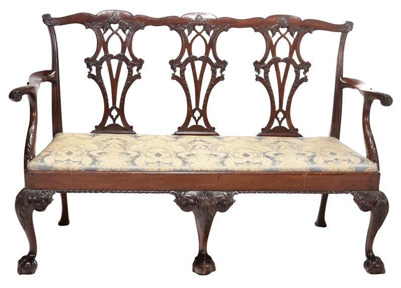 199 George III Carved Mahogany Open Armchair 18th century, carved crest and pierced Gothic splat, scrolled hand grips, cream upholstered slip seat, 39-1/2 x 30 x 23 in.