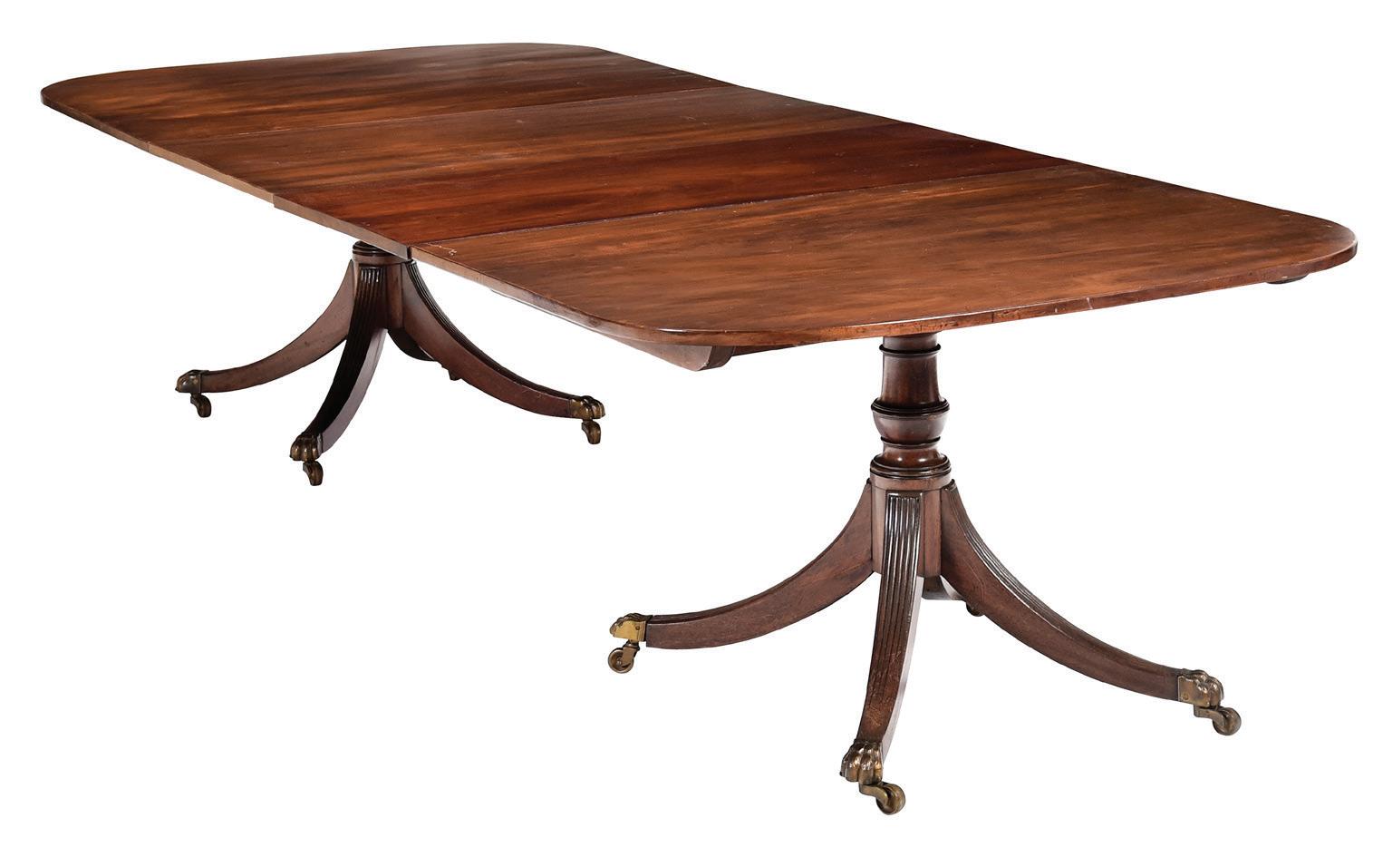 200 Regency Figured Mahogany Two Pedestal Dining Table British, 19th century elements, figured solid mahogany top, pedestal bases with brass casters, two leaves, 27-1/2 x 48 x 68 in., opens to 113 in. with two leaves
