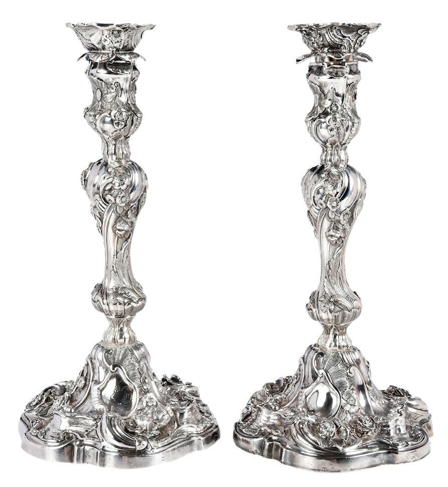 Pair of George III English Silver Tapersticks, William Cafe, London, 1771, shaped square bases with shells, gadroon borders, baluster stems, matching bobeche, marks for William Cafe, .925 fine, 10.35 oz. T., 5-1/4 in.