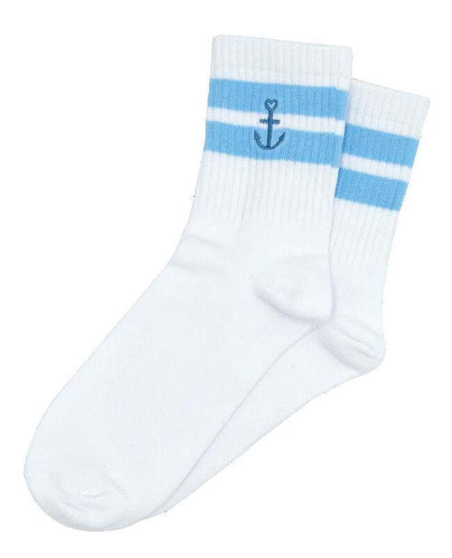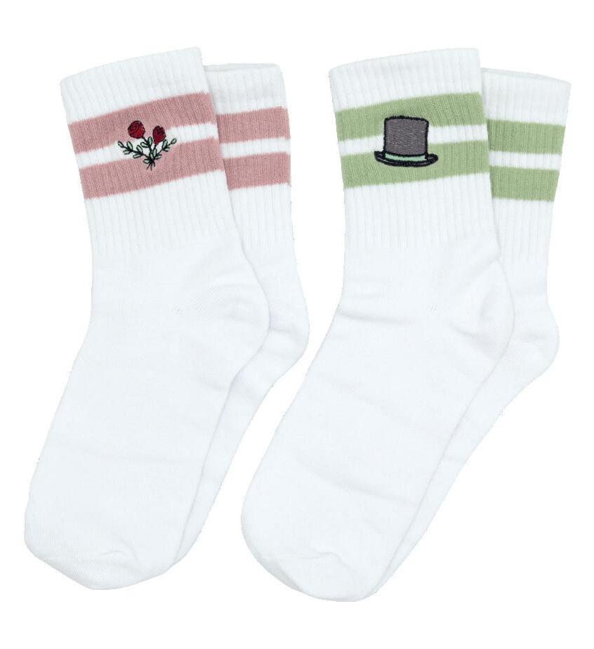 Socken mit Stickerei, in zwei Größen, Material: 85% Bio-Baumwolle, 12% Polyamid, 3% Elasthan, waschbar bei 30 °C, in Folie verpackt.