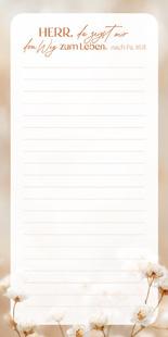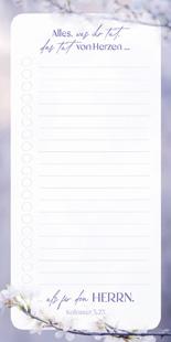 Die Kollektion Fatzer oral Küchen-Notizblöcke erscheint im blumig-eleganten Design mit thematisch passenden Bibelversen. So wird man auch in Alltagssituationen an Gott erinnert. Zum Auslegen oder dank des Magneten auch zum Befestigen an metallischen Hintergründen geeignet. Einzeln mit Banderole verpackt. 50 Blätter, verleimt, mit Rückwandpappe und Magnetstreifen. Format: 10 x 21 cm (DIN lang).