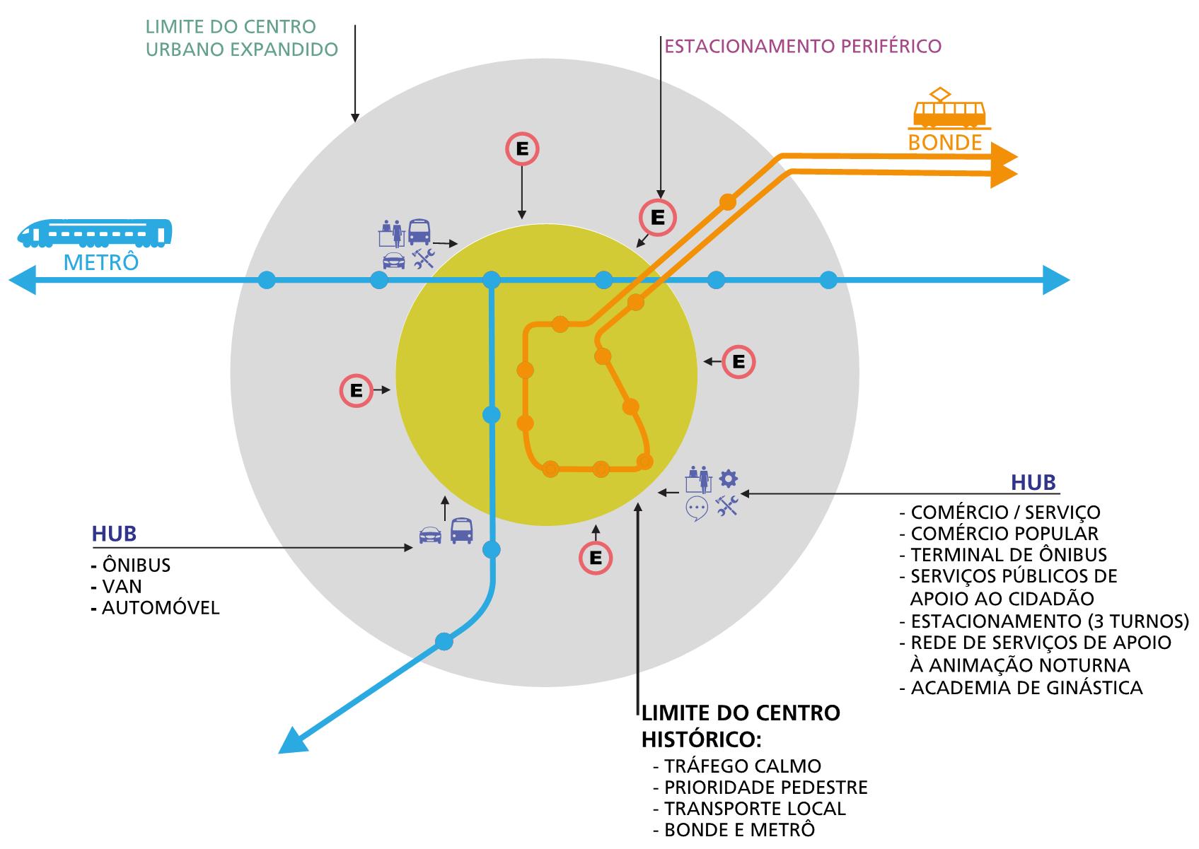 1- Propor uma área de trânsito calmo, delineada pelo percurso dos bondes elétricos, na qual será limitado o uso de veículos automotores e incentivando o transporte ativo pelo aumento dos passeios e áreas verdes.
