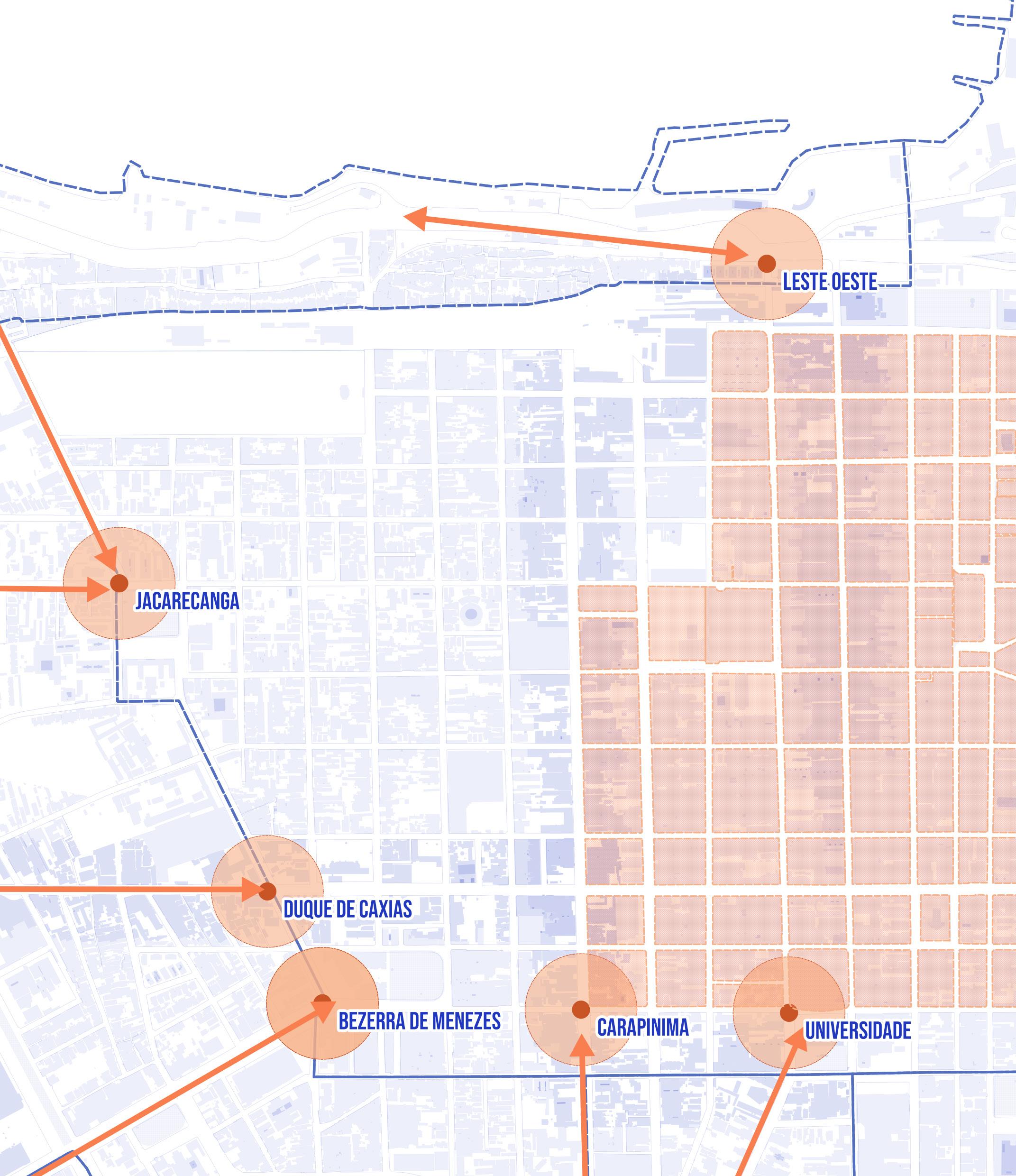 A área de intervenção escolhida para o análise e desenvolvimento do proje to se localiza no quadrilátero do bairro Centro que concentra maior fluxo di ário de pessoas e maior intensidade de atividades realizadas. Essa área pode ser compreendida pelo perímetro das ruas Padre Ibiapina, Meton de Alencar, João Moreira e Dom Manuel.