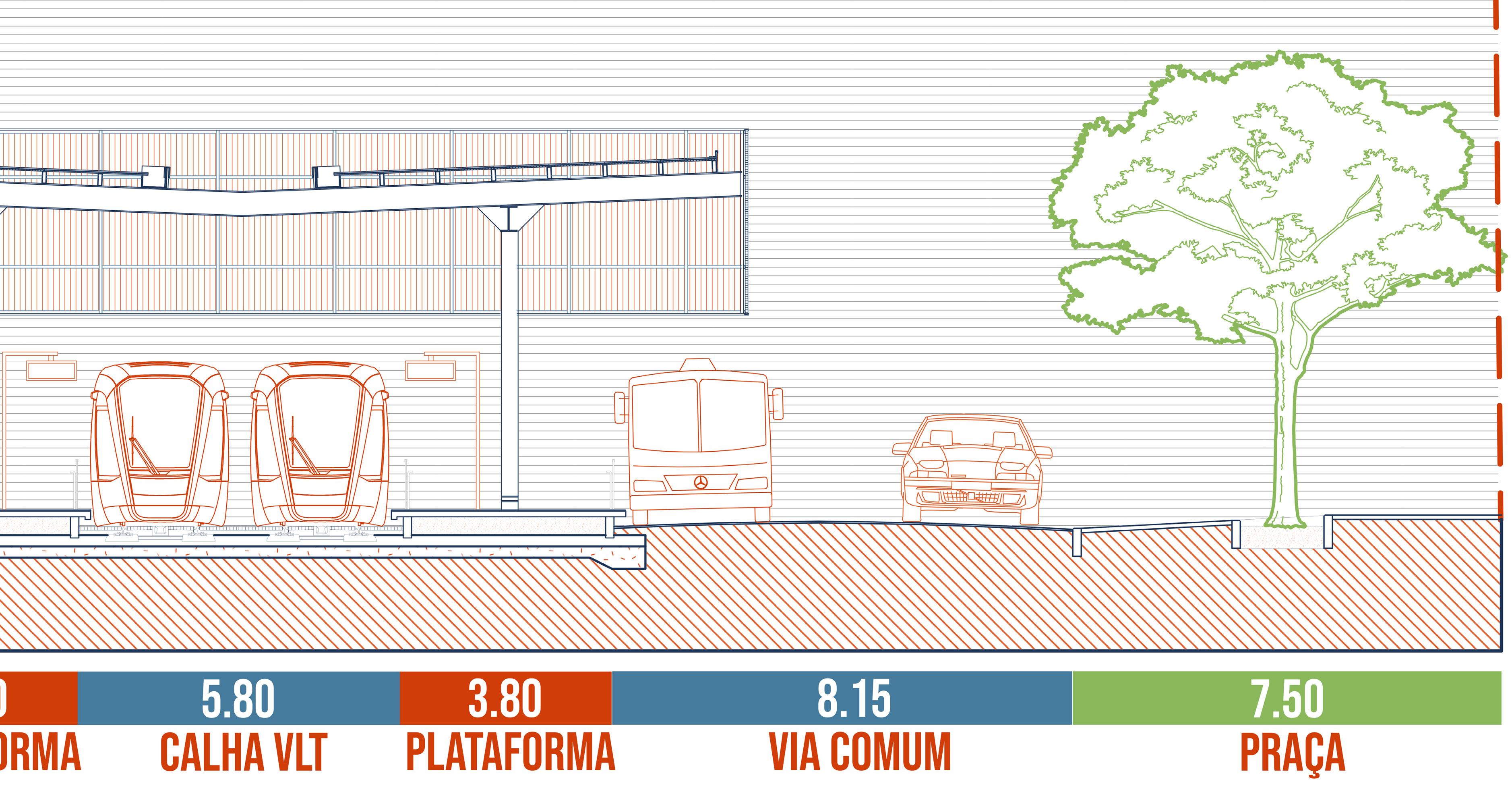 embarque central para os pas sageiros do VLT e o embarque lateral para as linhas de ônibus que tem essa estação como ponto de retorno.
