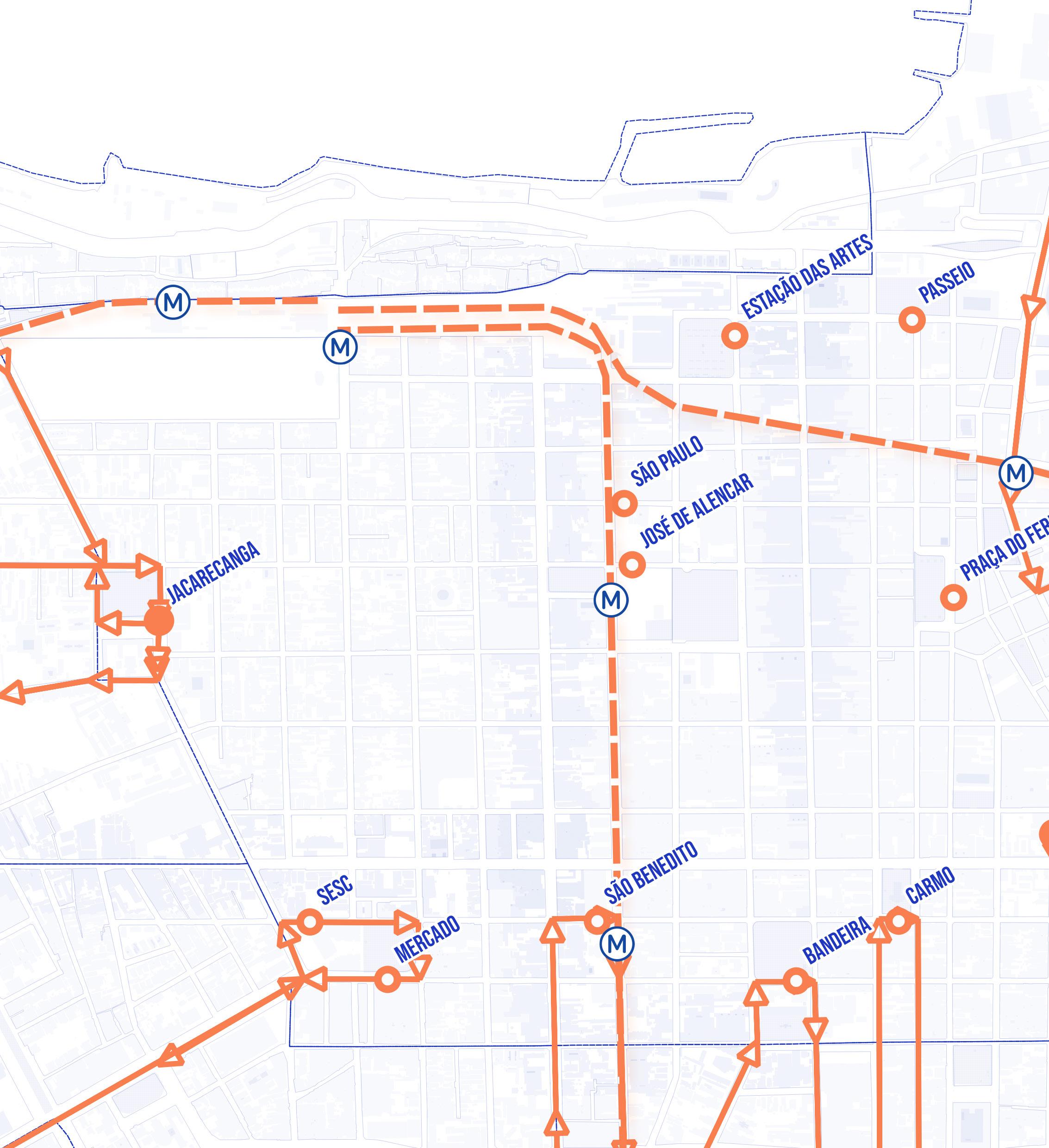 Para atingir seu objetivo, o percur so escolhido para ser utilizado pelos bondes elétrico deve ter como foco as estações de transporte de grande flu xo já existentes como as estações do METROFOR e miniterminais que se
