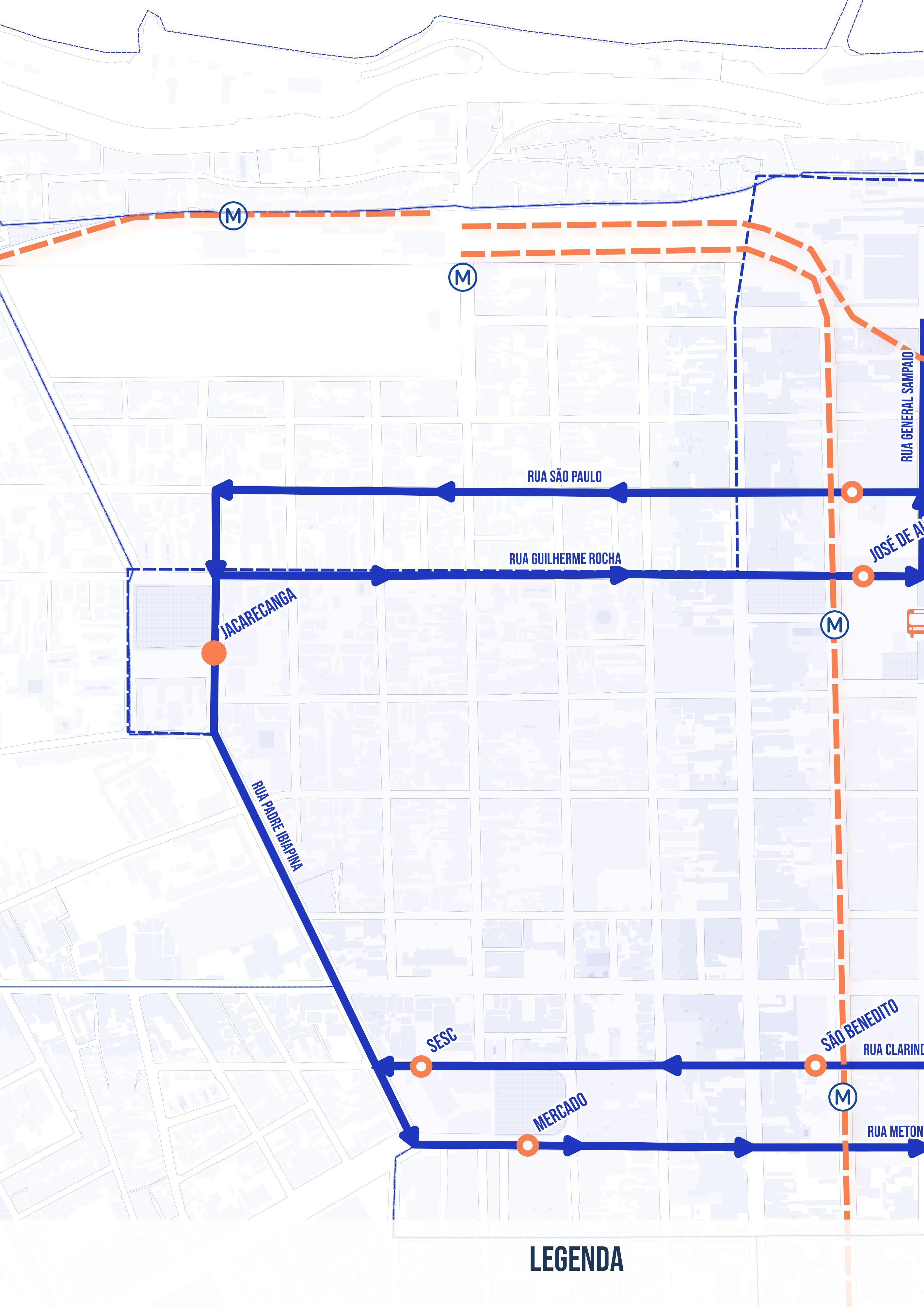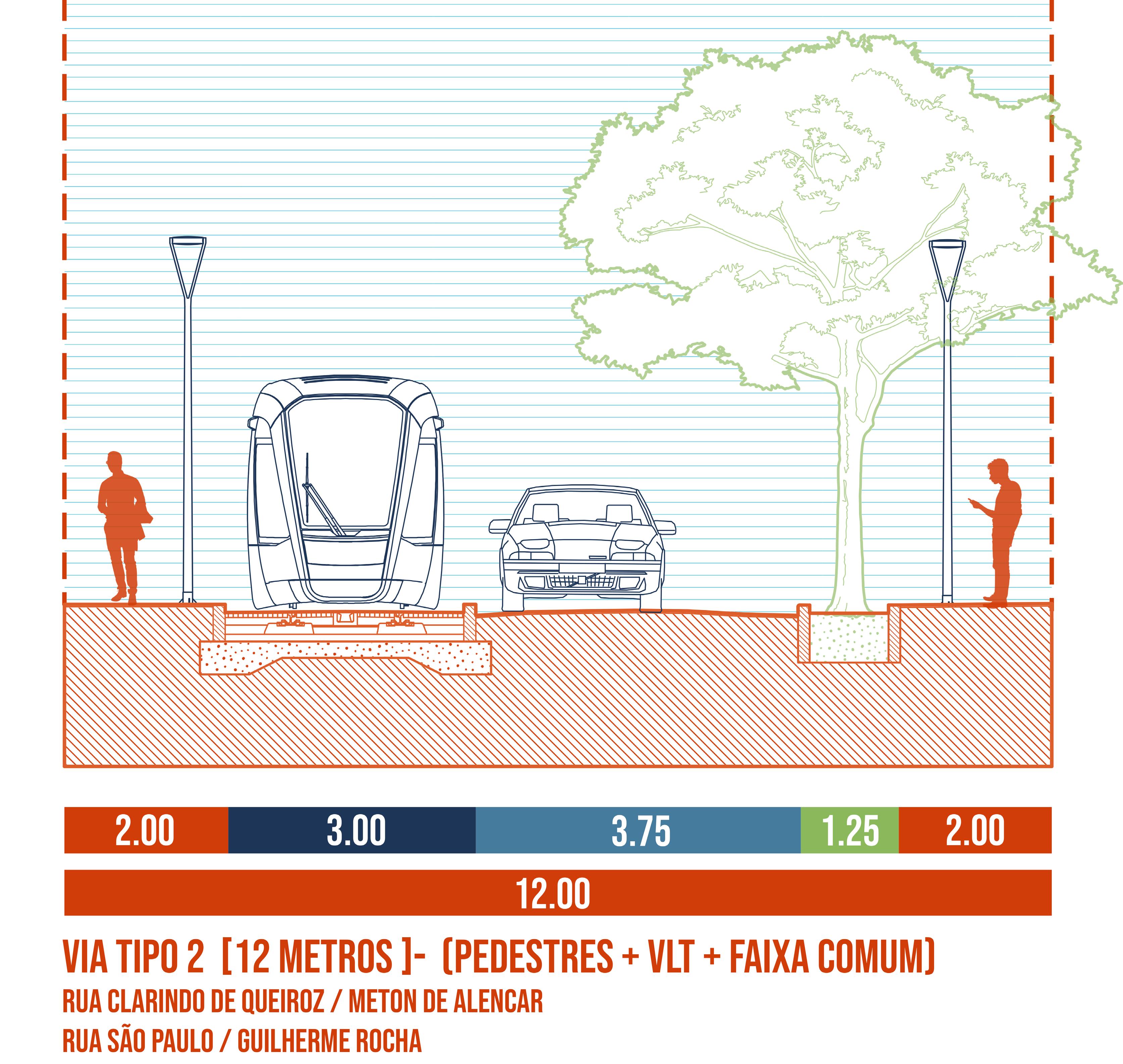 Nesse aspecto, o traçado composto é estruturado para amenizar os impactos da diminuição das caixas viárias já existentes, mas ao mesmo tempo distribuindo o espaço urbano de forma mais adequada e justa para pedestres, ciclistas e usuários do transporte público e privado. Por isso as vias do sentido Oeste-Leste (Rua São Paulo, Rua Guilherme Rocha, Rua Clarindo de Queiroz e Rua Meton de Alencar) foram projetadas sob as seguintes diretrizes: 1. Aumentar os passeios e calçadas garantindo a segurança e acessibilidade dos pedestres; 2. Ga rantir as livre passagem dos bondes com uma faixa de rolamento sobre trilhos exclusiva e livre; 3. Criar uma faixa de rolamento larga de 4 metros compartilhada para os demais veícu los, incluindo bicicleta, automóveis e ônibus com velocidade limitada.
