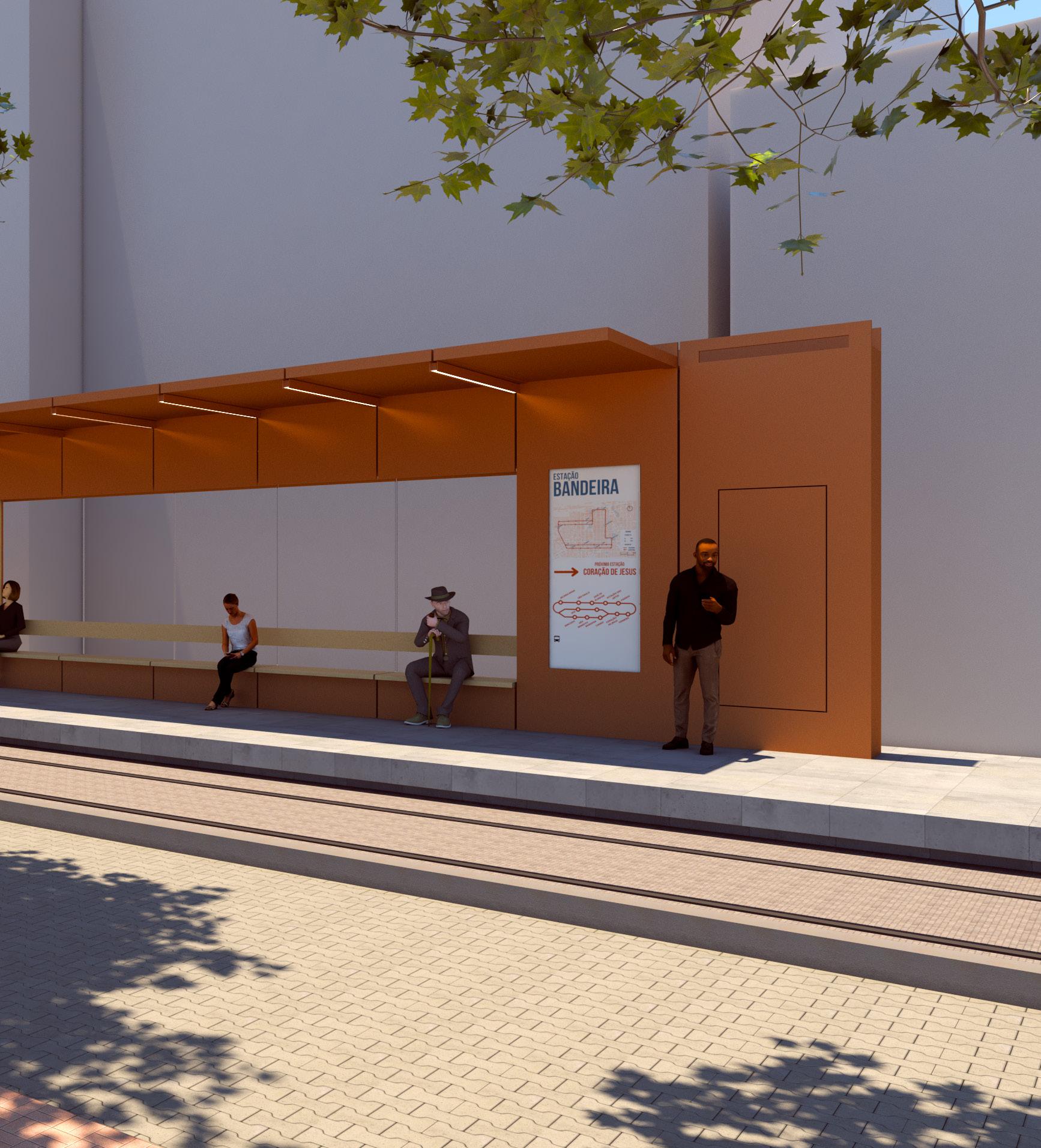A tipologia de estações de sim ples foram alocadas em dez das doze paradas do circuito proposto, são caracterizadas por uma plataforma simples e aberta com um abrigo na parte central. Os abrigos foram proje tados a fim de concentrar todos