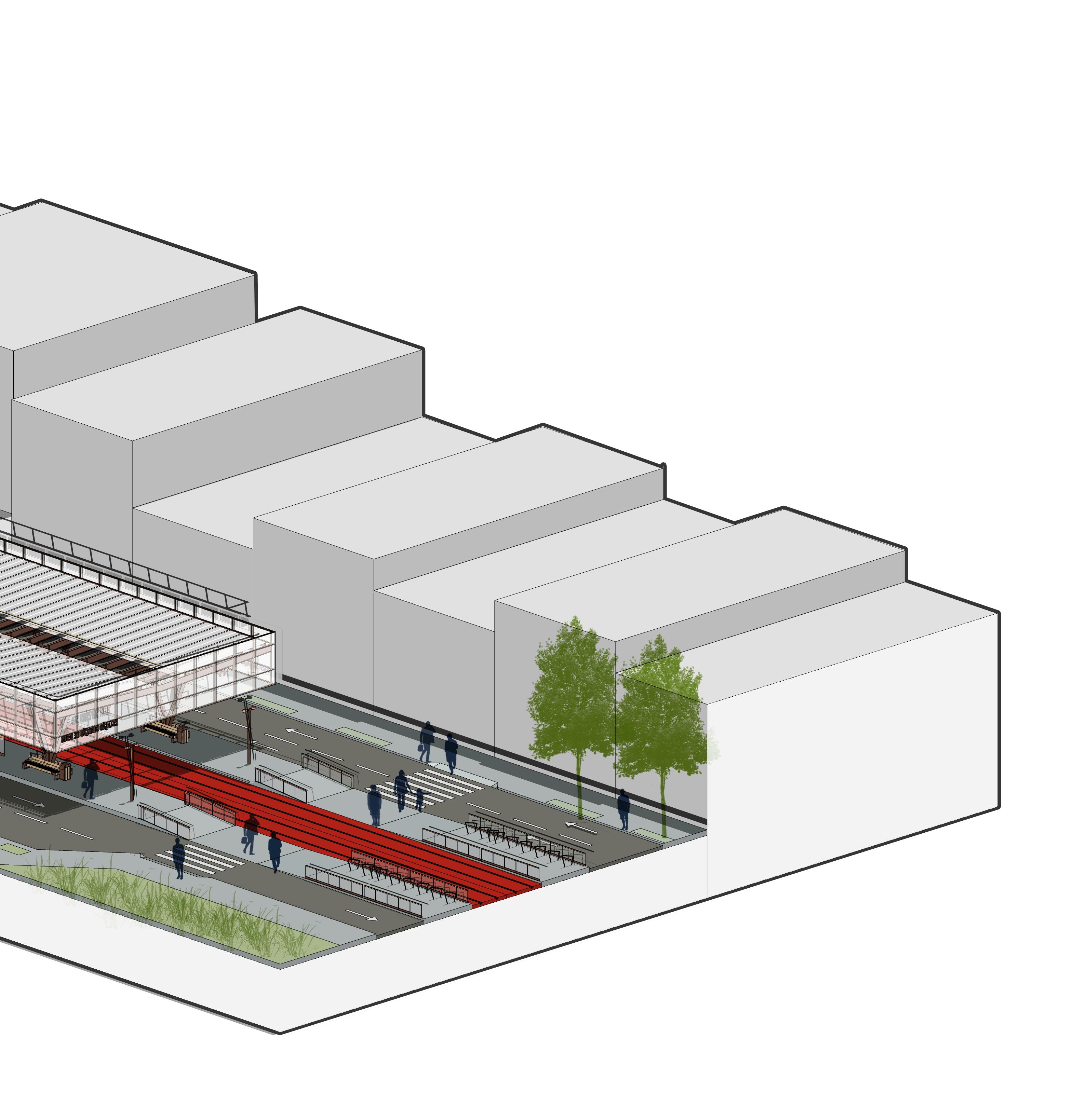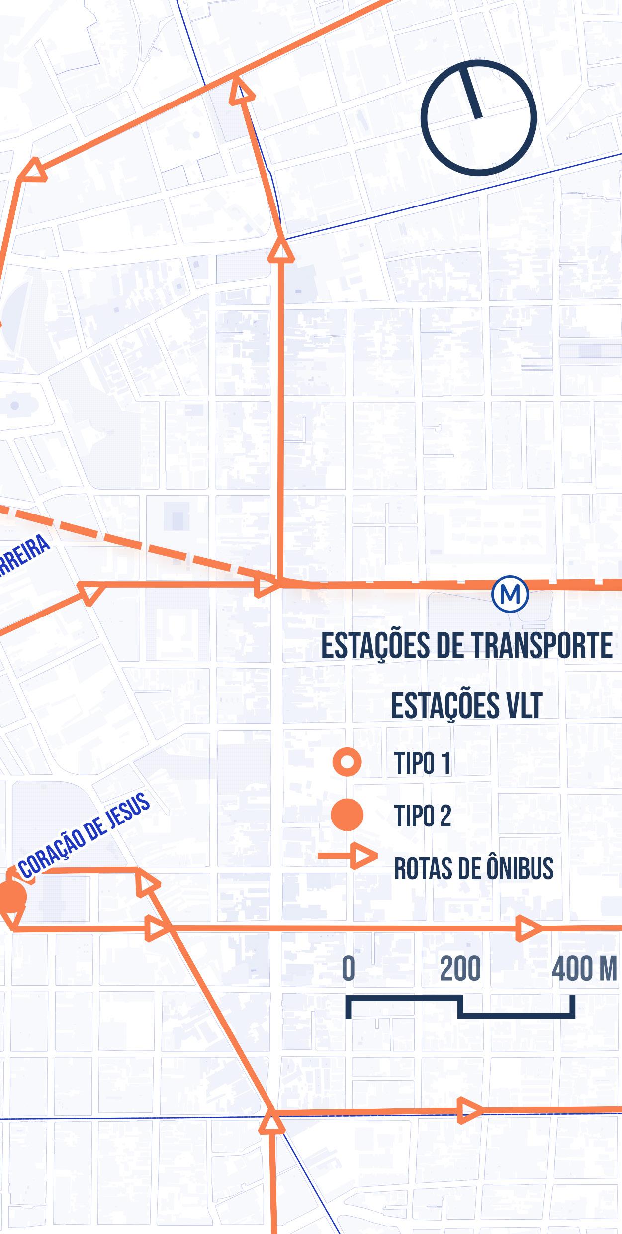 A partir da identificação desses por tais, foi pensado o fortalecimento dessas entradas para atuarem como espaço de transferência entre modais evitando que o trânsito de veículos precise adentrar o núcleo histórico do bairro. Além disso, a criação do percurso de bondes foi elaborada em forma circular, a fim de interligar essas entradas captando os usuários do sistema e distribuindo para a proximidade dos seus destinos. Esse traçado também atua como arco protetor da malha viária do Centro, que sofre com alterações e estrangulamentos dessa região. Outro importante fator a ser considerado na formulação do sistema é a localização adequada das estações, que devem ser posicionadas em locais seguros, de fácil acesso e de grande movimentação. A partir disso, é possível alocar estações que garantam a integração entre os modais, a boa captação dos usuários e a destinação dos fluxos de acordo com a necessidade dos passageiros.