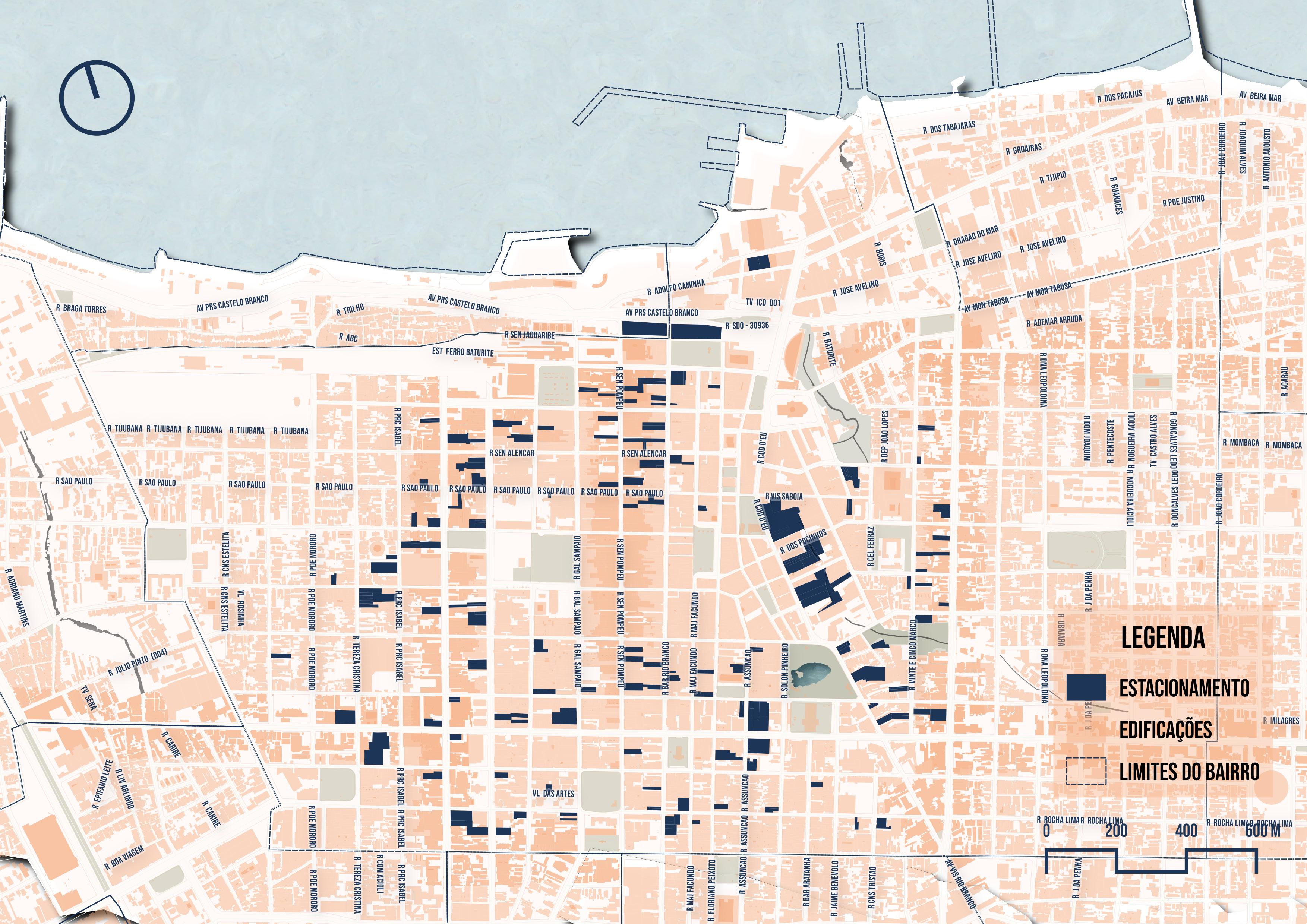 Atualmente, existem cerca de 15,6 ha de área usada como estacionamento na área de estudo conforme espacializado no mapa 5. Muitas vezes, esses lotes de estacionamentos foram construídos em terrenos que haviam casas ou prédios importantes, como foi o caso do casarão dos Gondim, construído em 1911 e demolido em 2021 para ampliar um parque de estacionamentos ao lado (Imagem 8 e 9). A demolição ocorreu após permissão judicial na madrugada