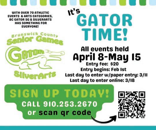 Registration is now open for the 2026 Brunswick County Gator Senior Games and SilverArts competition for adults ages 50 and older. Registration is open until March 15.