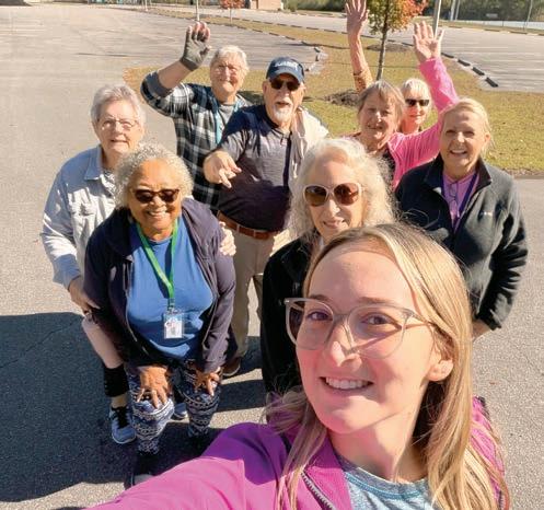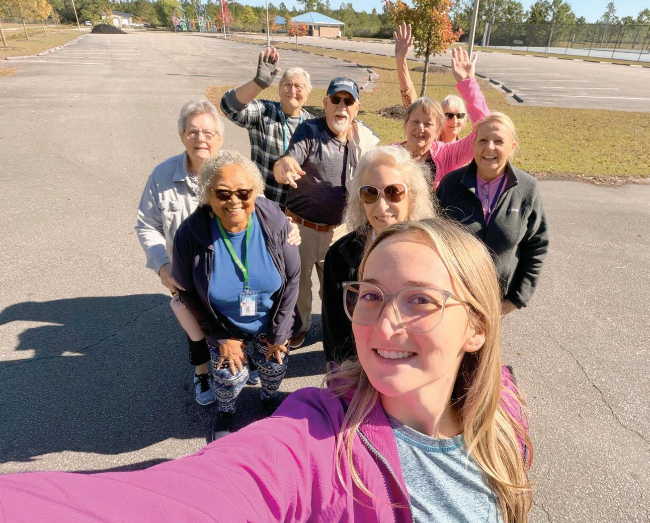 Selfie time! Taking advantage of the pretty weather, Program Manager Madison Garrell leads participants on an outdoor walk. The group covered the half-mile loop in the park behind The Brunswick Center at Waccamaw. Enjoying the sunny day are, from left to right: Wanda Evans, Mary Collins, Jeanette Mintz, Waddell Evans, Broni Holcombe, Madison Garrell, Teresa Johnson, Alta Mae Inman, and Beverly Lewis.