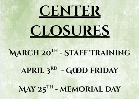 Friday, Mar 20th - Staff Training Friday, Apr 3rd - Good Friday Monday, May 25th - Memorial Day