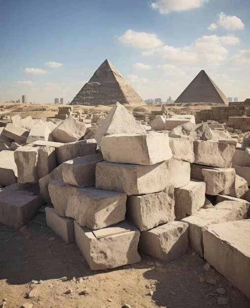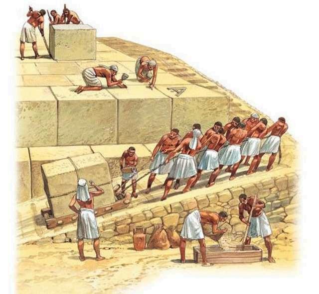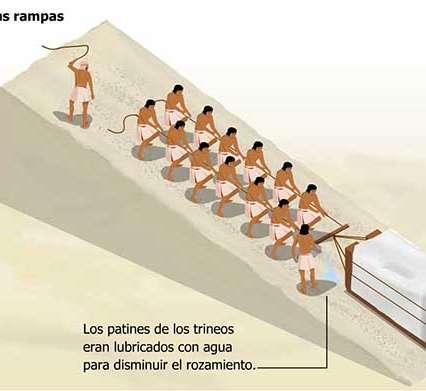 Para elevar los enormes bloques de piedra, los egipcios desarrollaron un sistema de rampas hechas de barro, tierra compactada y piedras. Estas rampas podían ser rectas, extendiéndose suavemente hasta la cima, en espiral alrededor de la estructura para evitar grandes distancias, o zigzagueantes para facilitar el transporte. Los bloques se movían usando trineos y mano de obra. Una vez completada la construcción, las rampas se desmantelaban o se dejaban como parte del relleno de la estructura.