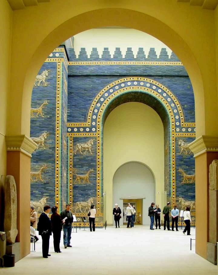 La Puerta de Ishtar presenta un arco monumental flanqueado por torres, con un diseño simétrico y relieves detallados. Las figuras de animales en los azulejos simbolizan el poder de la diosa Ishtar y la fuerza de Babilonia. Construida con ladrillos de cerámica vidriada, destaca por su brillo y colores vibrantes, característicos de la arquitectura babilónica.